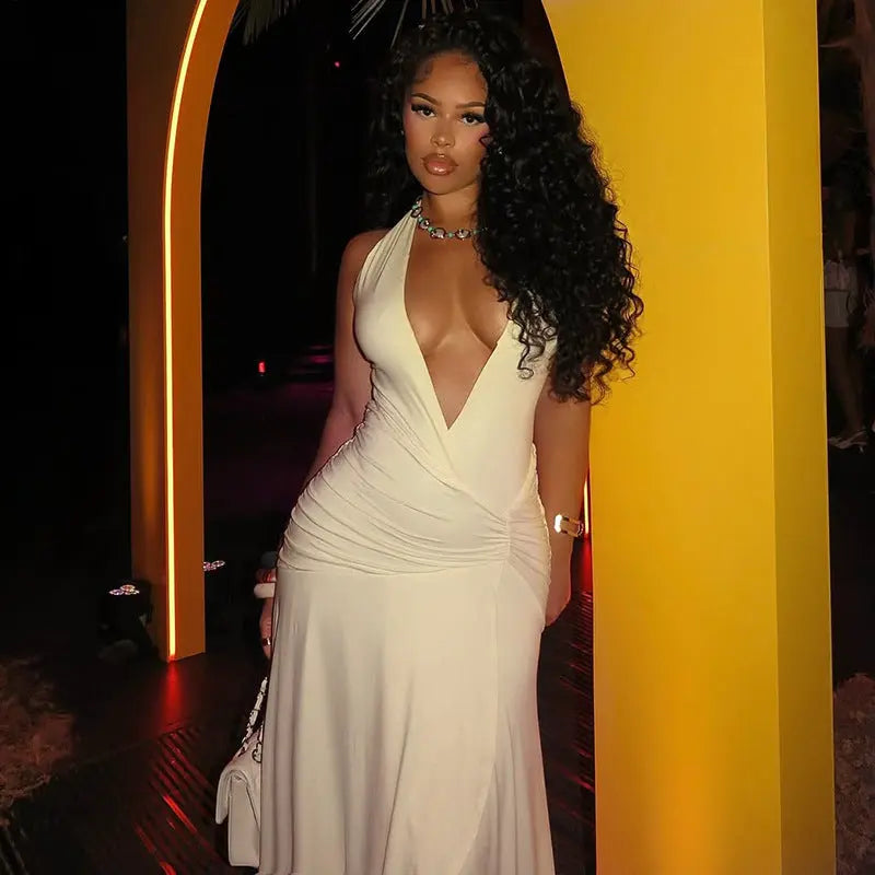 Women Clothing Waist Slimming Solid Color Hip V neck Pleated Draped Chest Wrapped Dress
