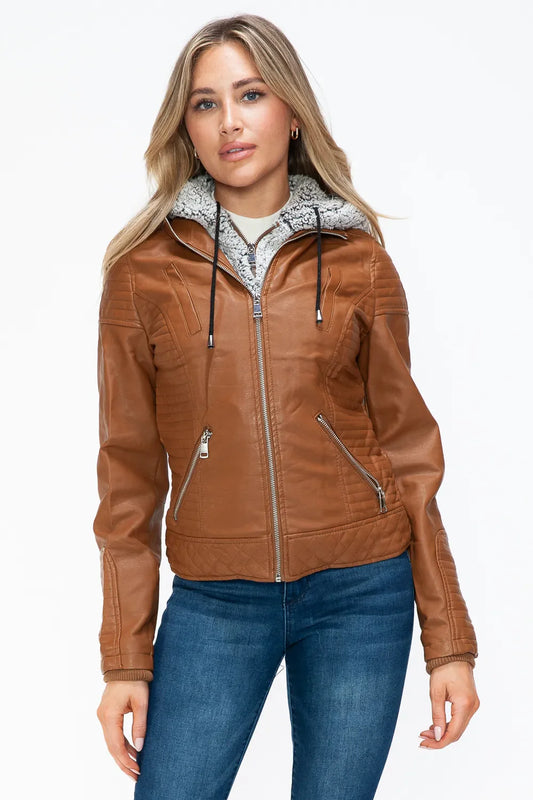 YMI Faux Layered Double-Zipper Jacket with Fuzzy Hood