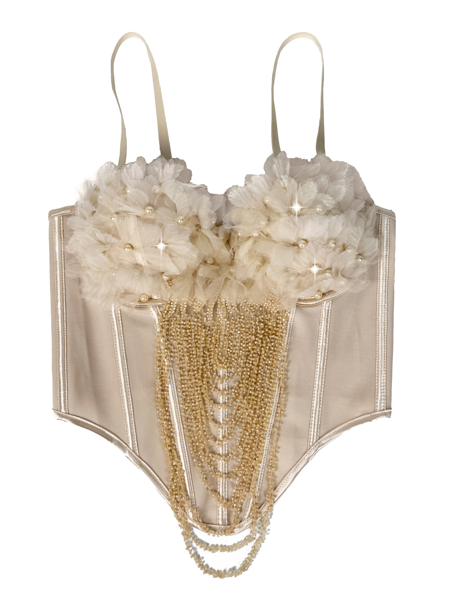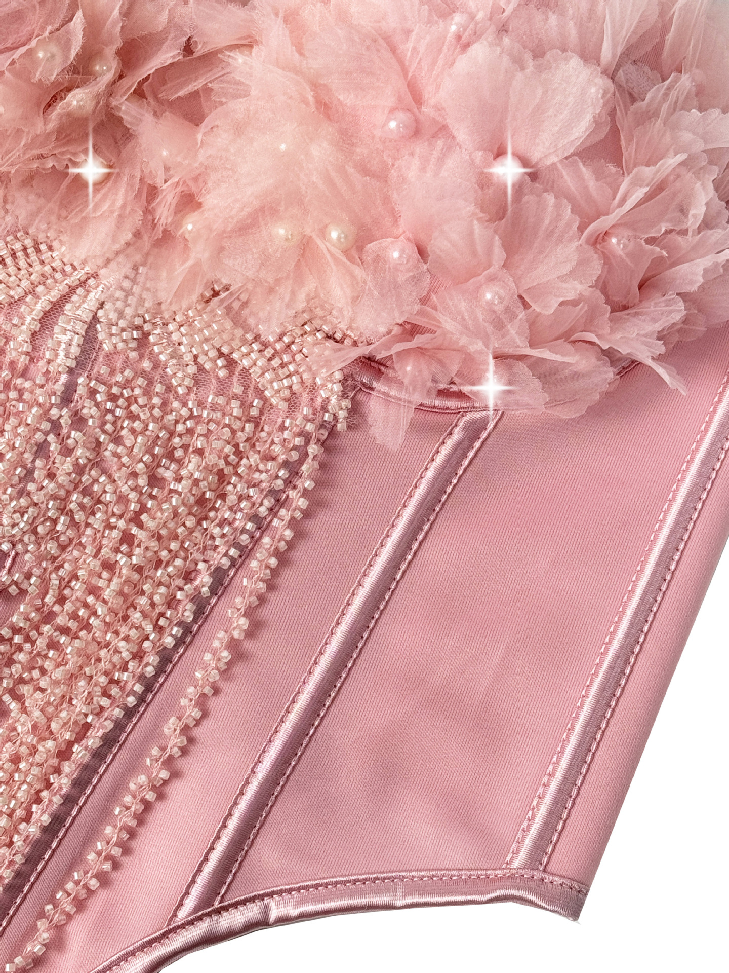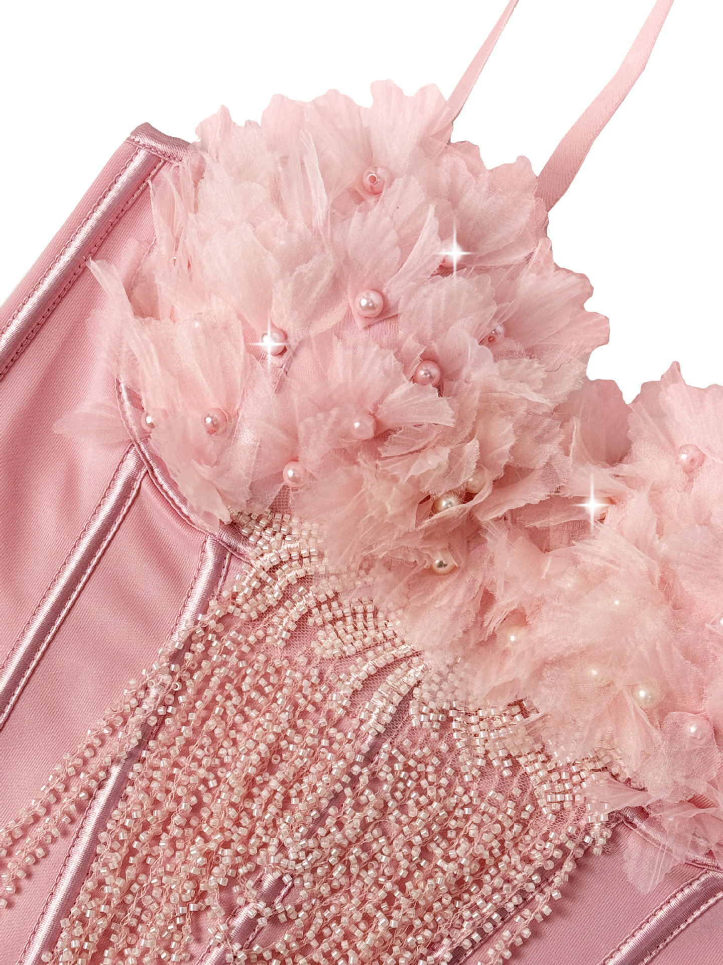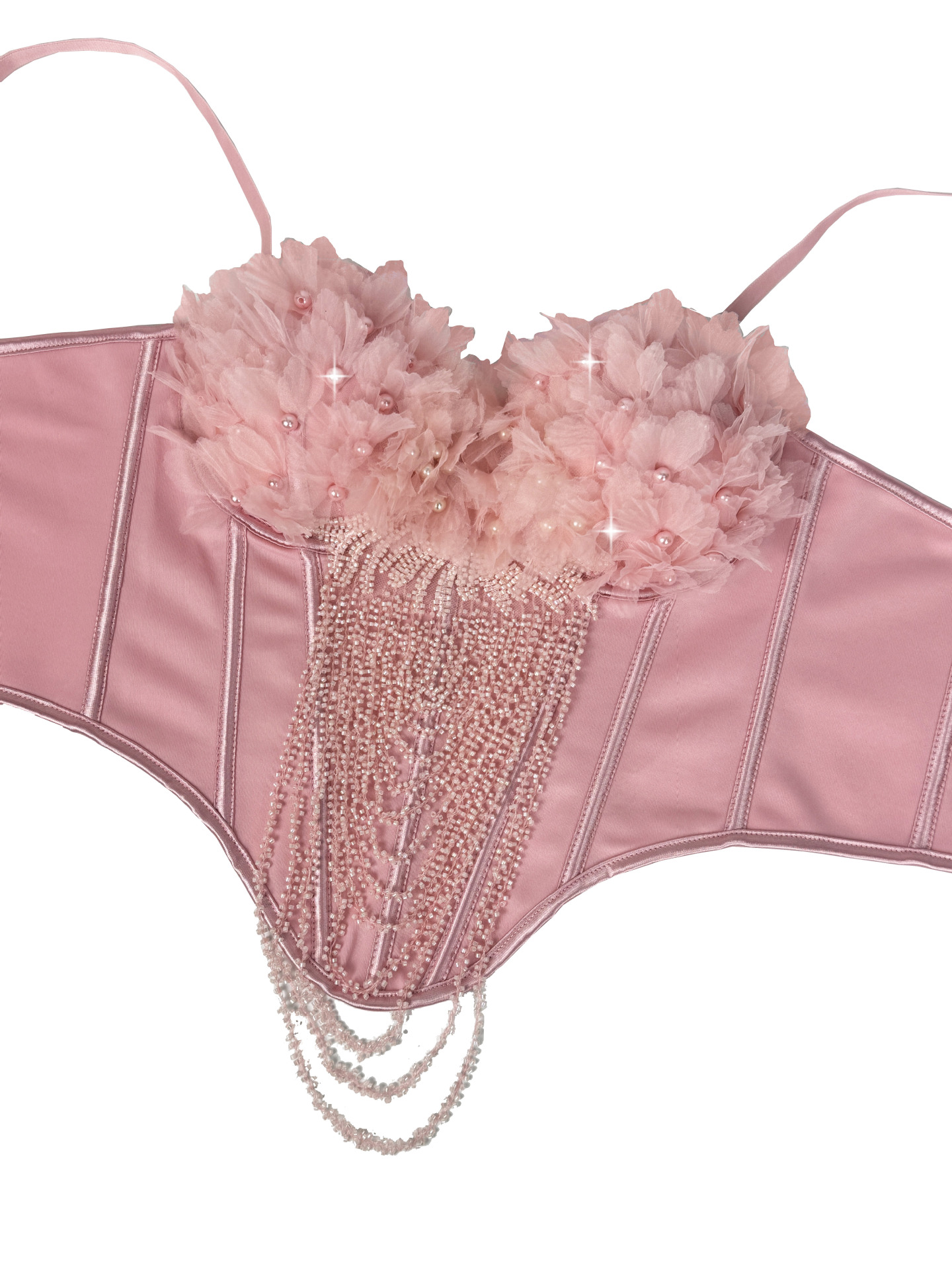 Pink Floral Tassel Corset Top With Beaded Bodice Backless Crop Bella Mia