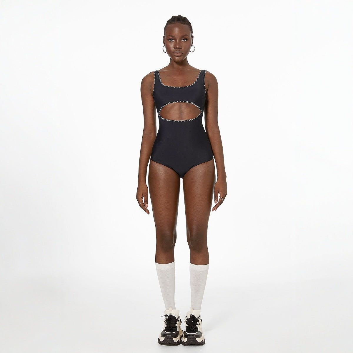 Retro Hook One Piece Swimsuit Women Simple Black Spring Beach Vacation Swimsuit