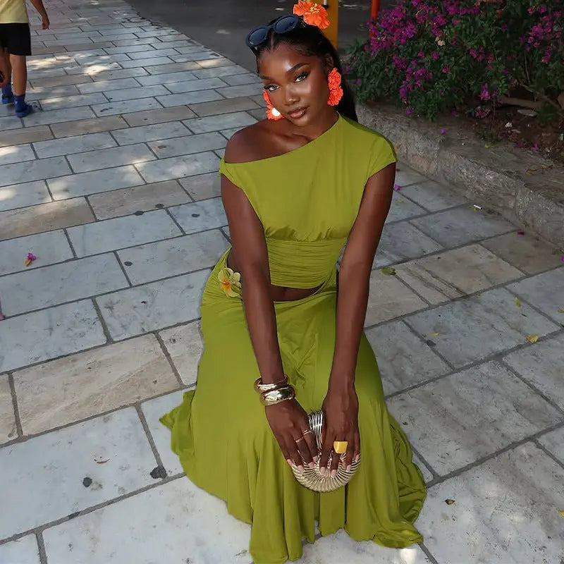 Women Clothing Summer One Shoulder Pleated Slim Fit Skirt Set Bella Mia