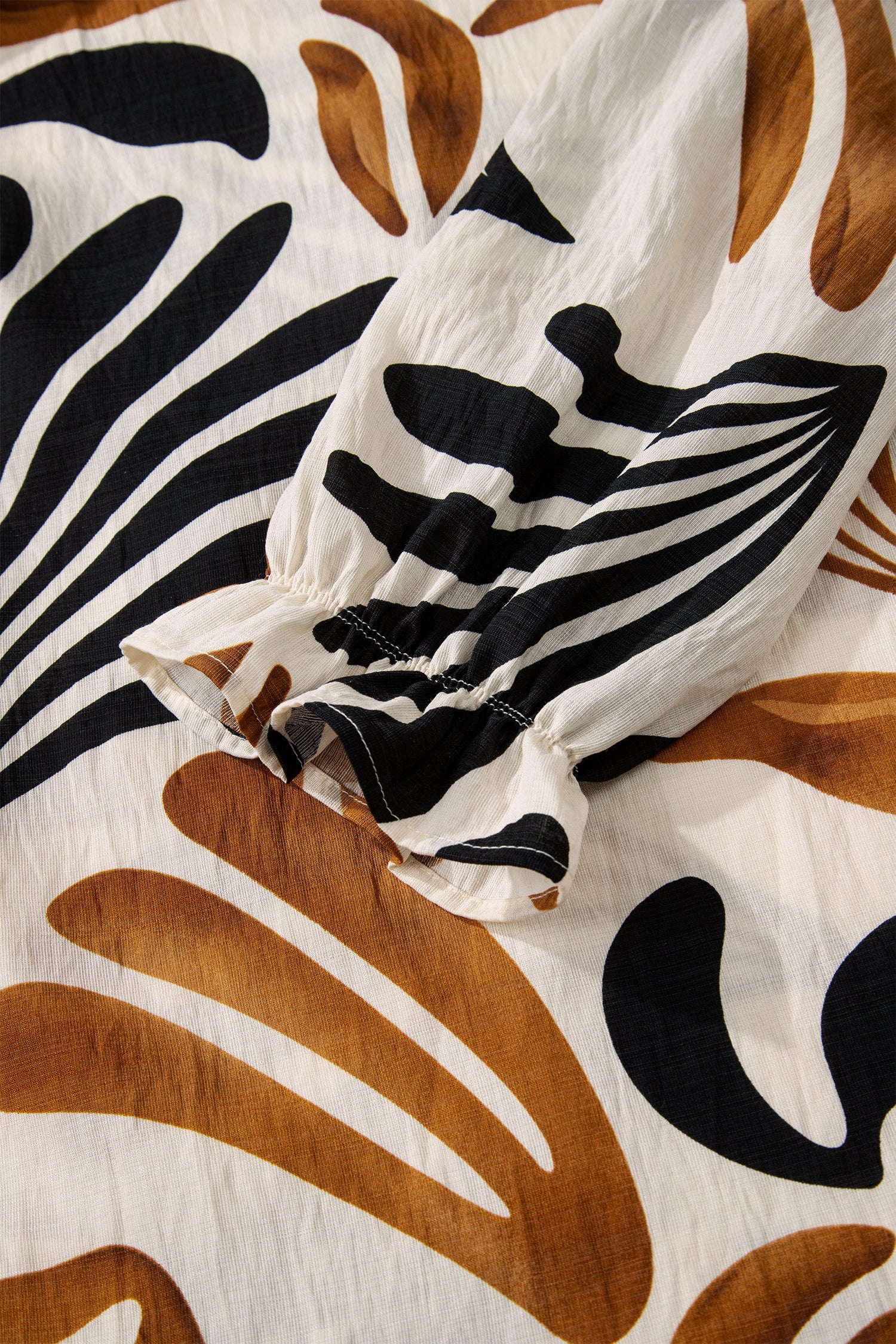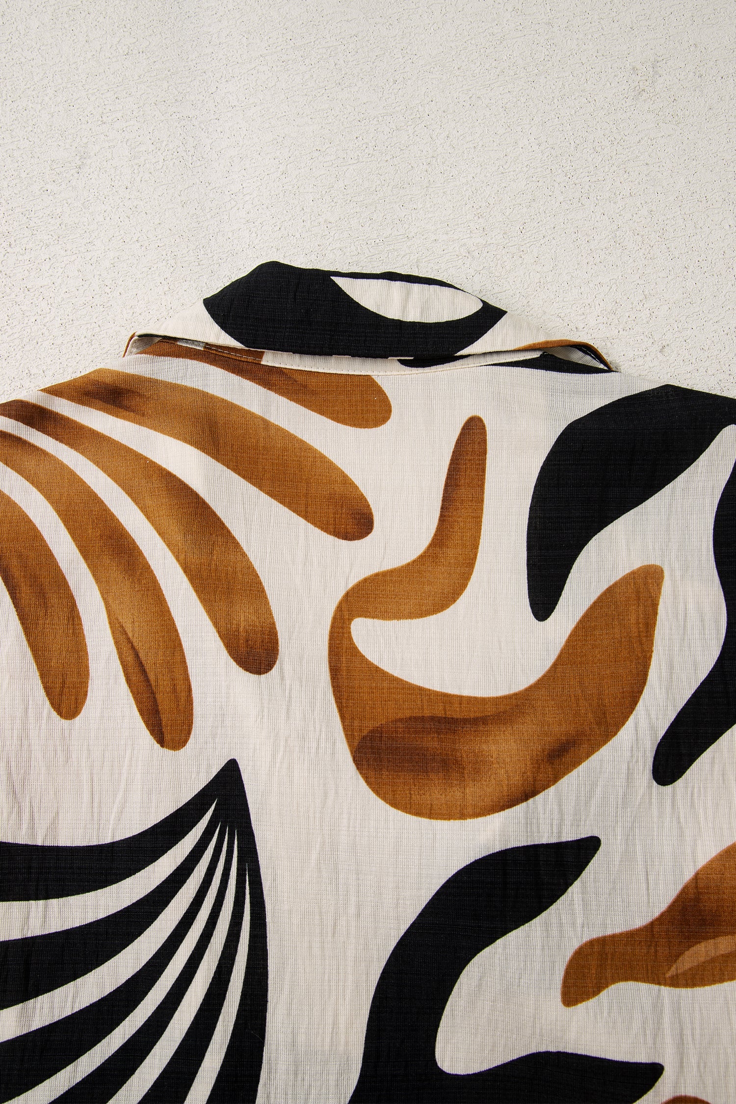 White Plus Size Abstract Print Dress With Contrast Collar Split Neck Long Dress