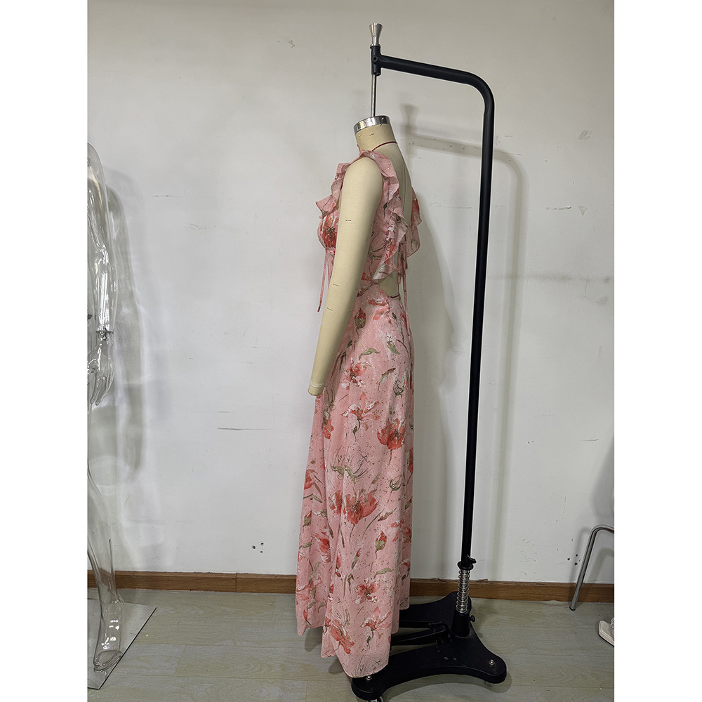 Printing Slip Dress Women Summer Sexy Gentle Waist Trimming Lace up Backless Large Swing Dress