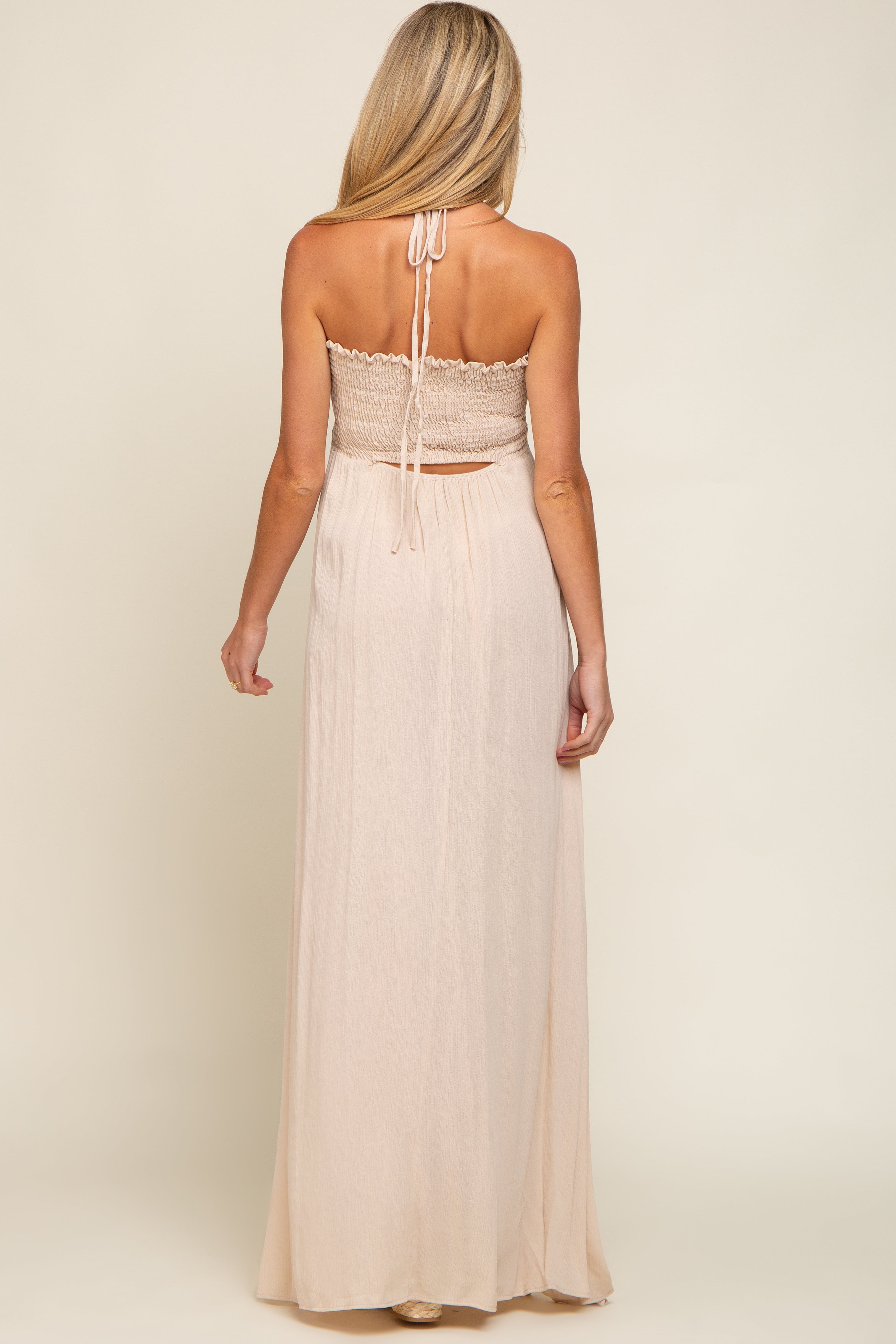 Elevate your effortless style with our Smocked Halter Maternity Maxi Dress. Designed to flatter your growing bump, this dress features a stretchy smocked bodice that provides comfort and support throughout pregnancy and beyond. The halter neckline adds a touch of elegance, while the flowing maxi skirt keeps you cool and chic for any occasion—baby showers, brunch, or casual outings. Soft, lightweight fabric drapes beautifully, making this dress a must-have for your maternity wardrobe. Pair with sandals for a laid-back look, or dress it up with your favorite accessories!