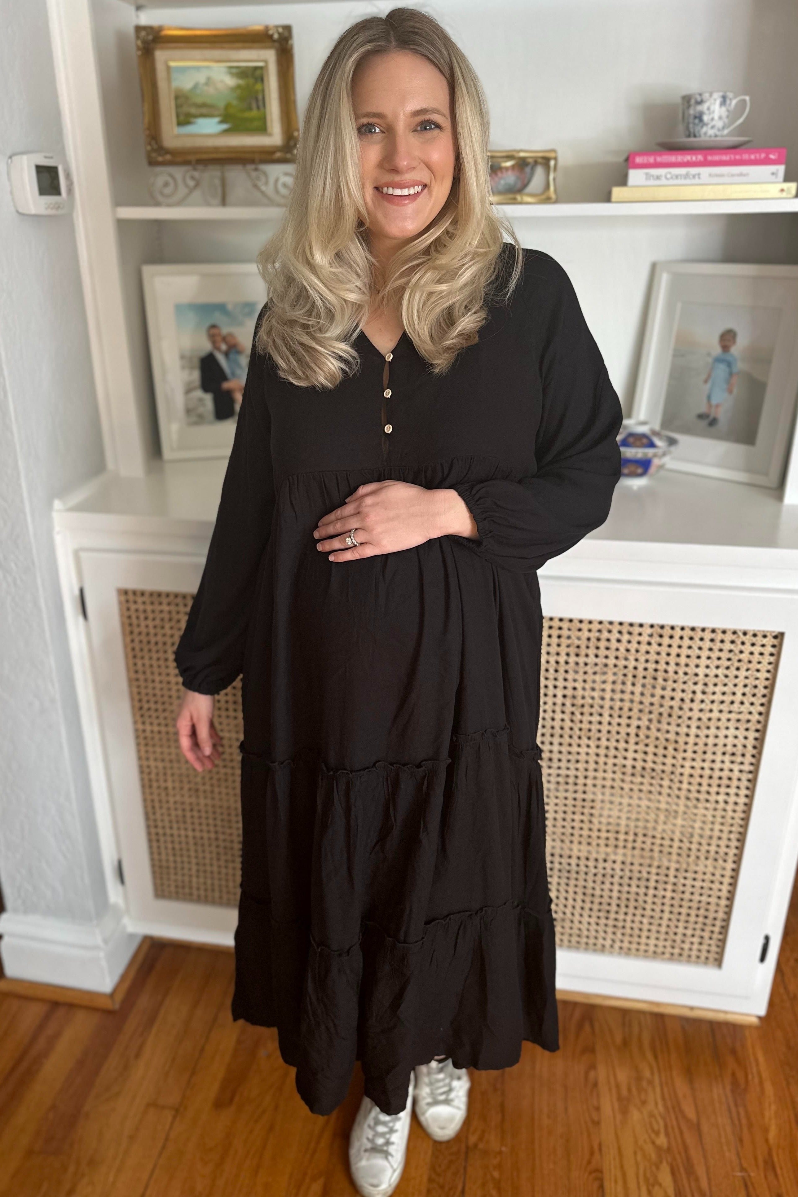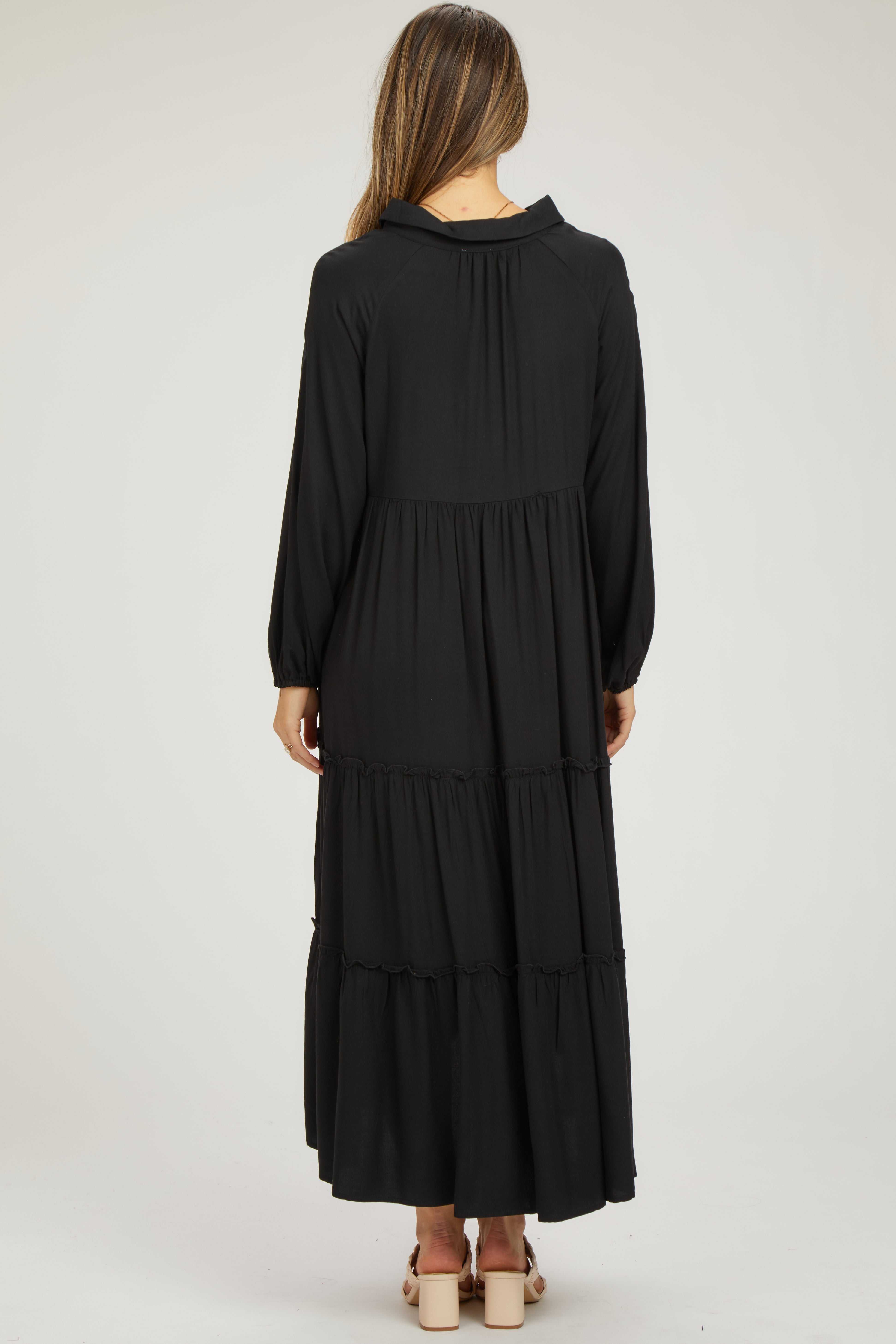 A maternity midi dress featuring a collared v-neckline with a button front, long sleeves and a tiered A-line skirt with lettuce edge trim.