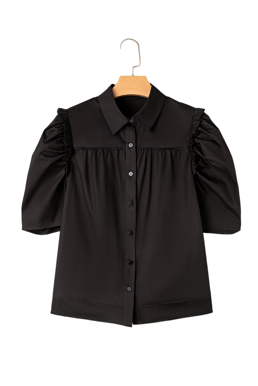 Black Solid Color Puff Sleeve Stylish Collared Shirt
