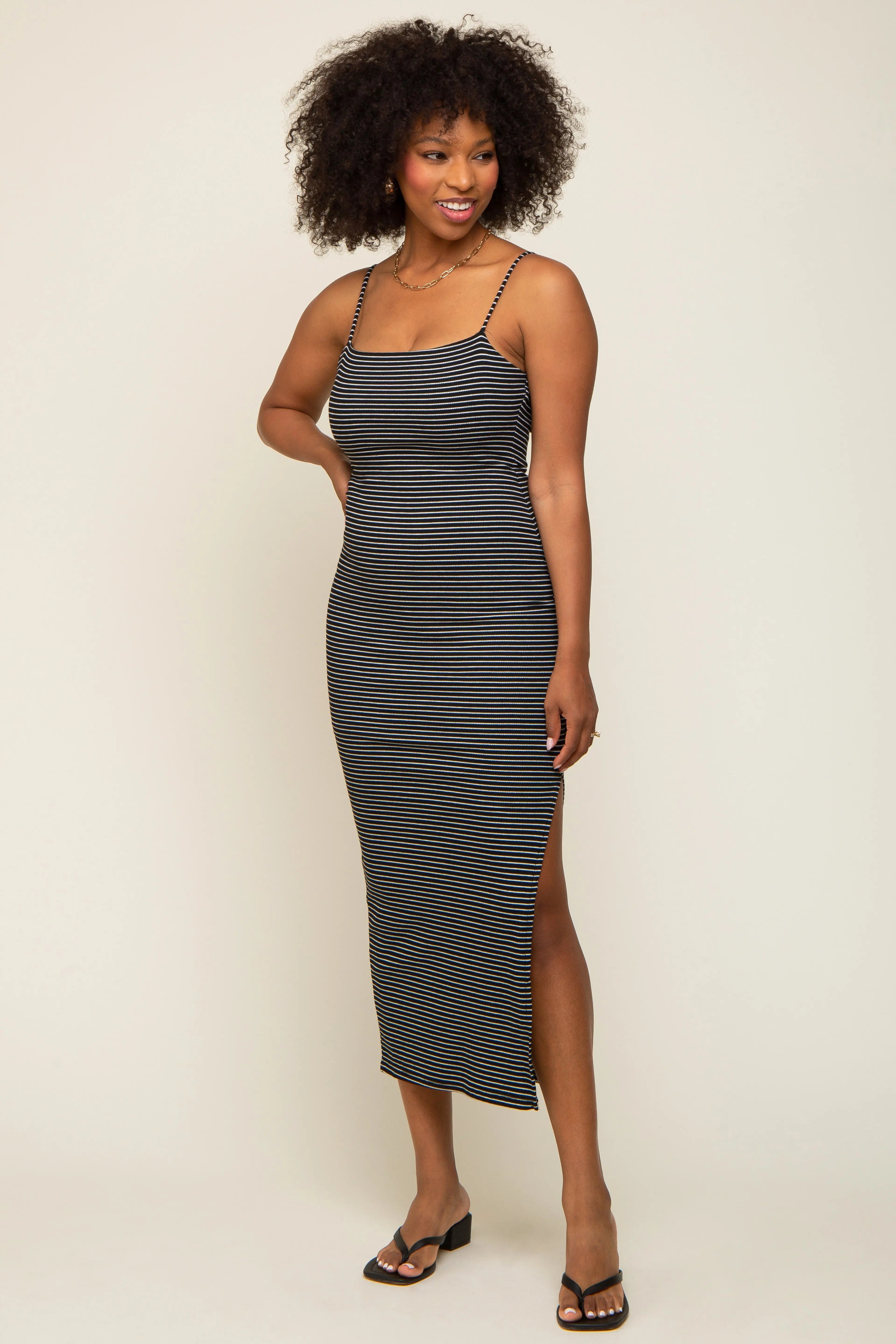 A striped fitted maxi dress featuring a side slit and a square neckline.