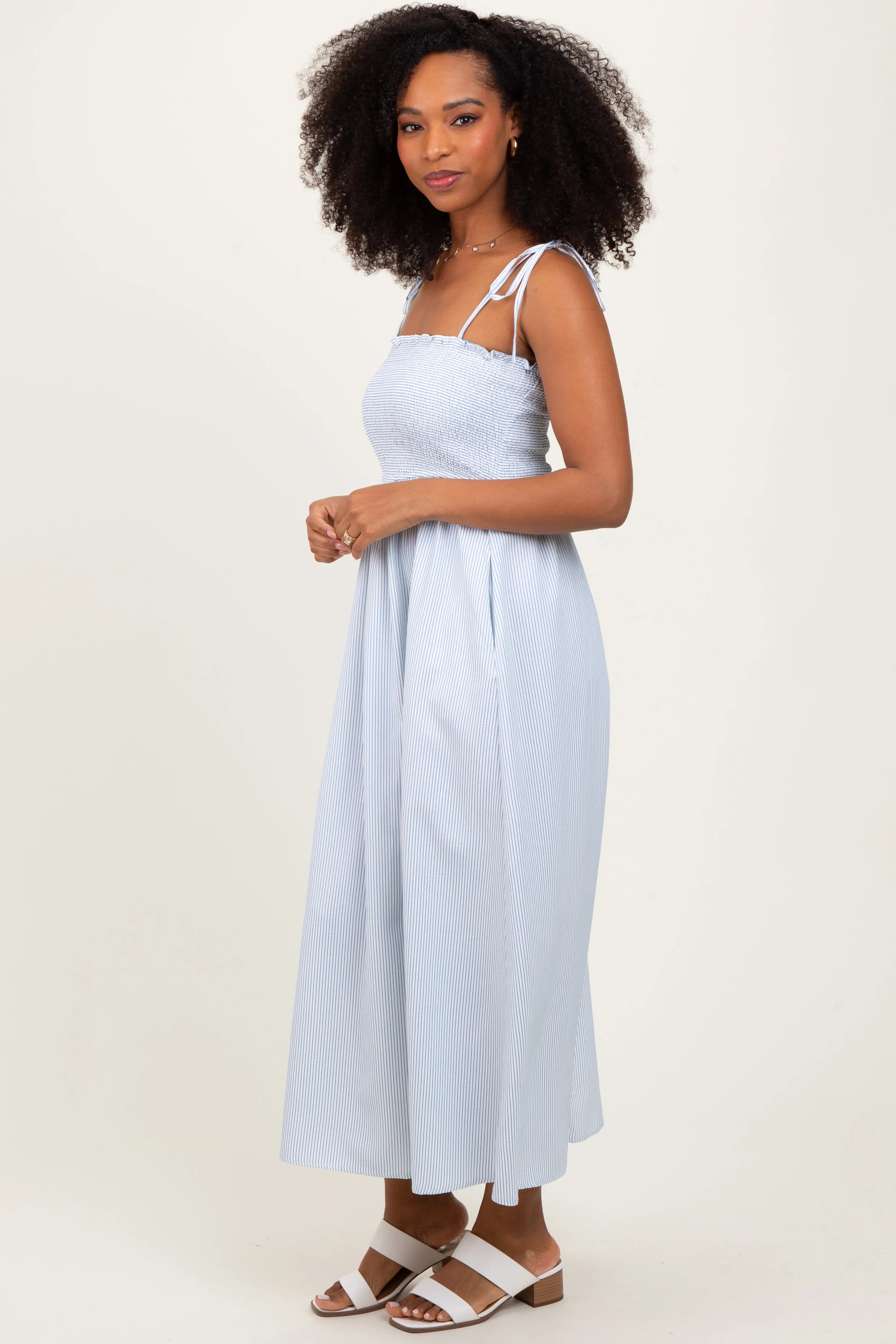 Blue Striped Shoulder Tie Smocked Maxi Dress PinkBlush