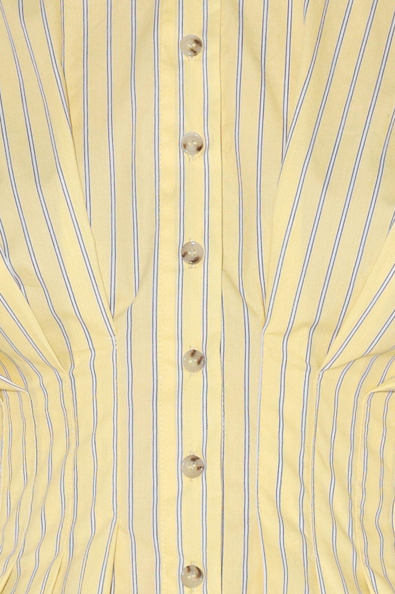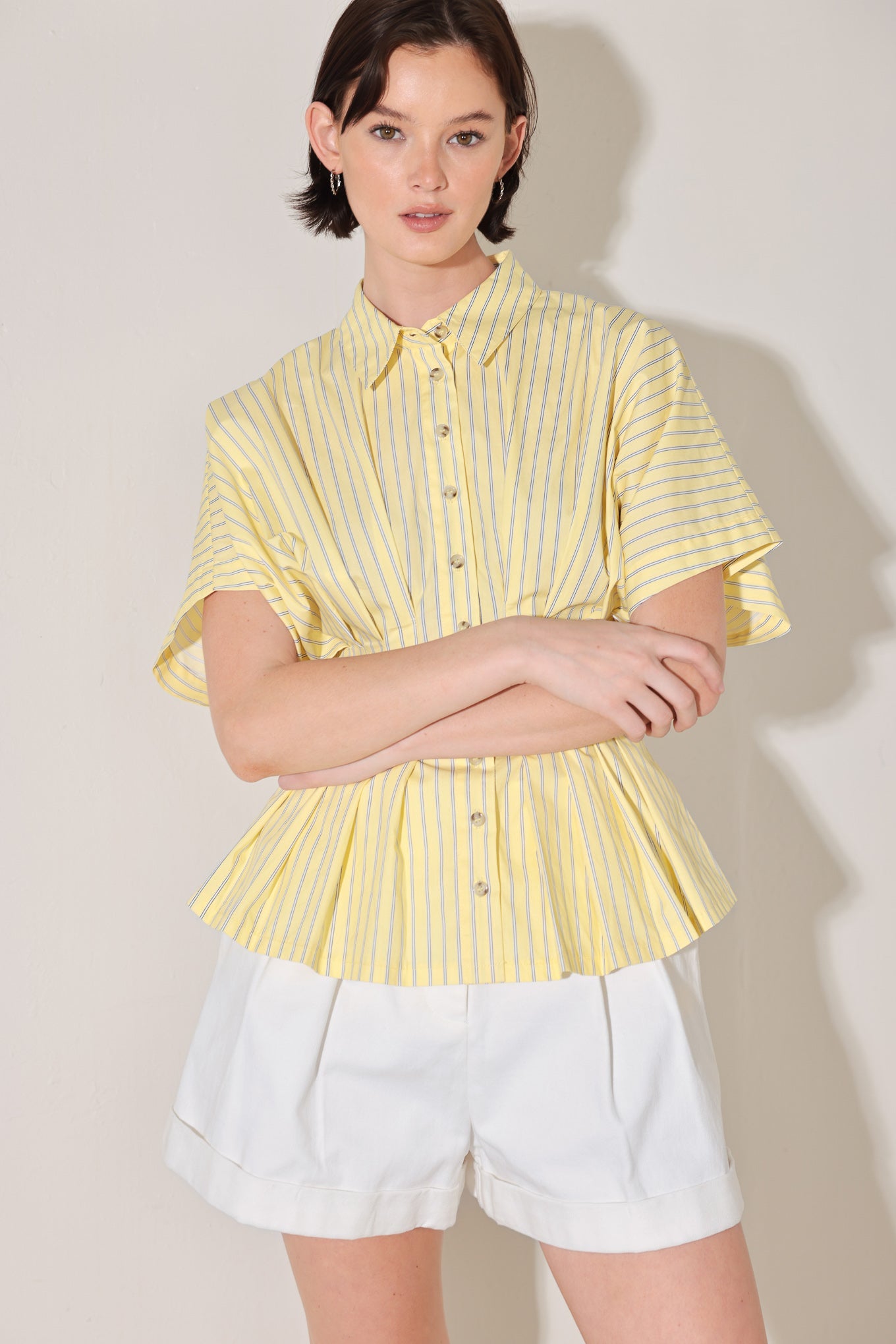 A striped woven top featuring collar, short dolman sleeve, button down, corset waist and peplum
