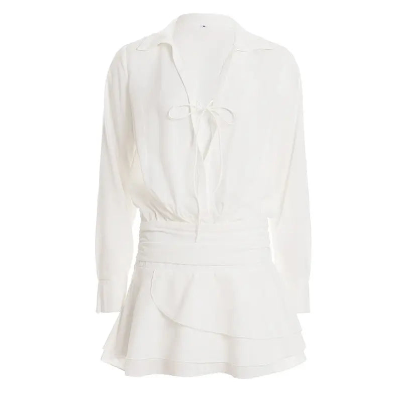 Casual Solid Color Hollow Out Cutout out Strap Stacked Long Sleeve Dress Women Deep V Plunge Drape Waist Tiered Dress Bella Mia