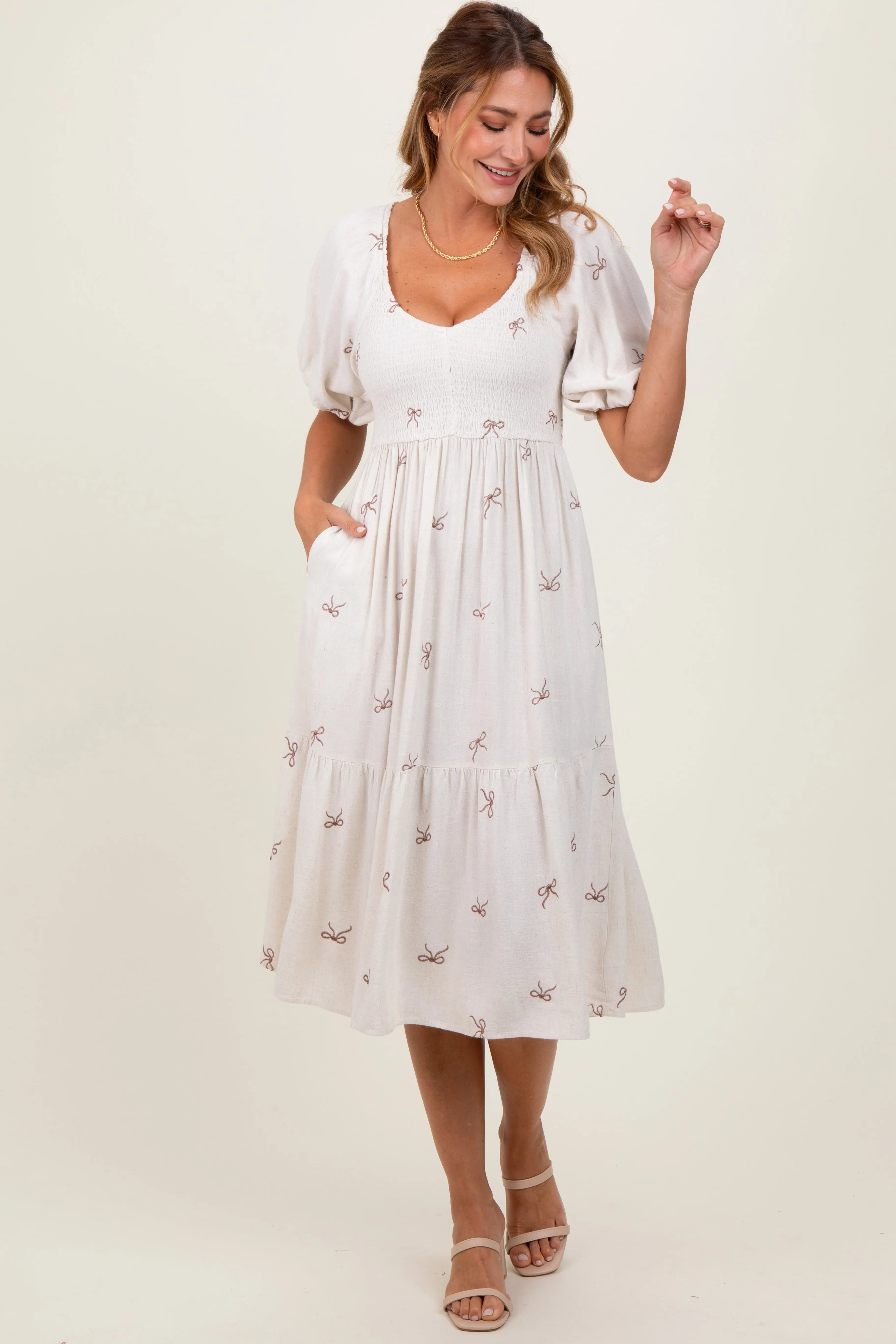 Experience comfort and style with this Ribbon Print Smocked Maternity Midi Dress, designed to gently embrace your growing bump. Featuring a smocked bodice for a flexible fit and puff sleeves with elastic cuffs, this dress offers both elegance and ease. The midi length with a tiered skirt creates a flattering silhouette, perfect for any occasion, from casual outings to baby showers. Crafted with lightweight, breathable fabric, it ensures all-day comfort and breathability. Pair it with your favorite sandals or heels for a chic maternity look that moves with you effortlessly.