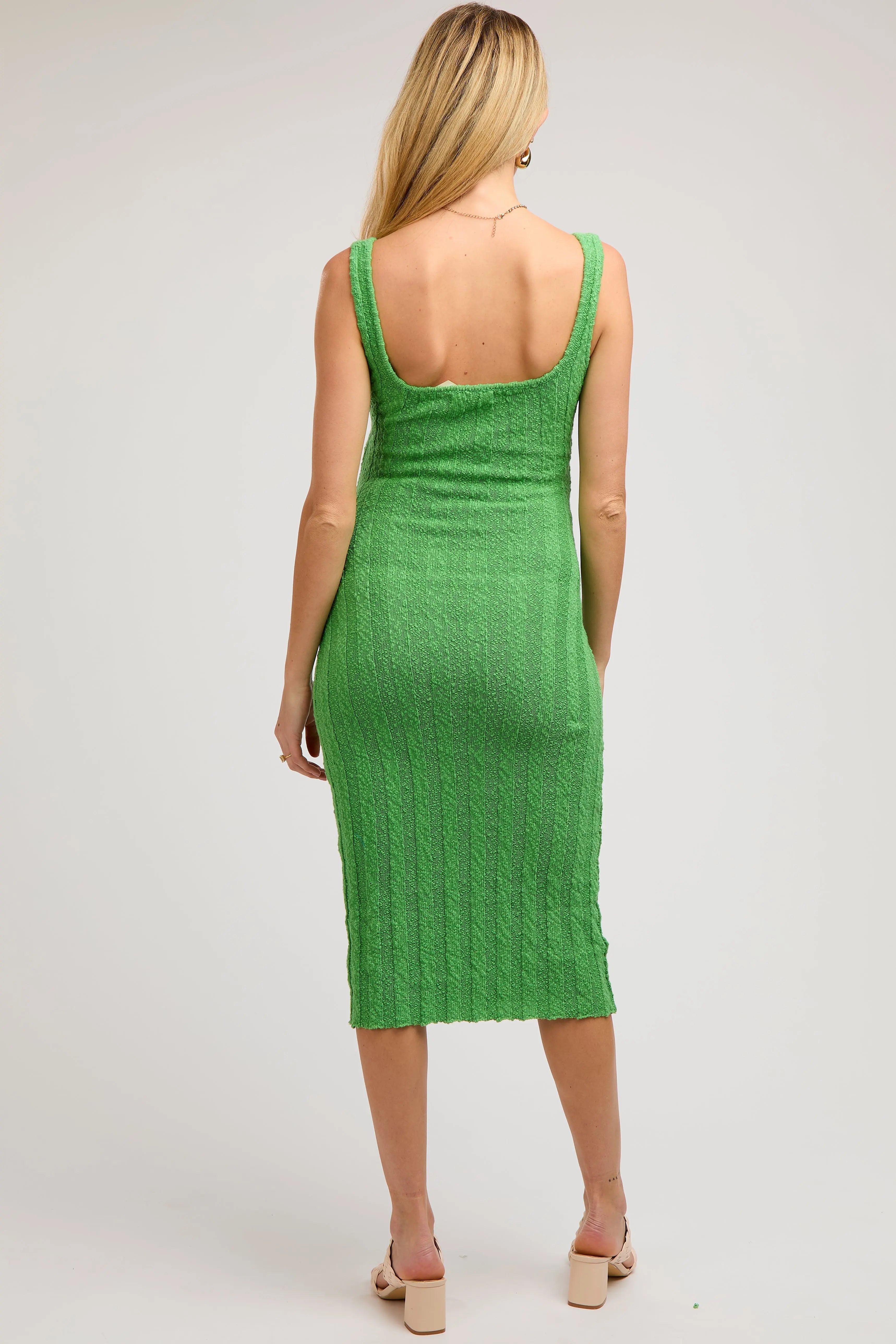A strapless, wide rib knit maternity midi dress with a squared neckline.
