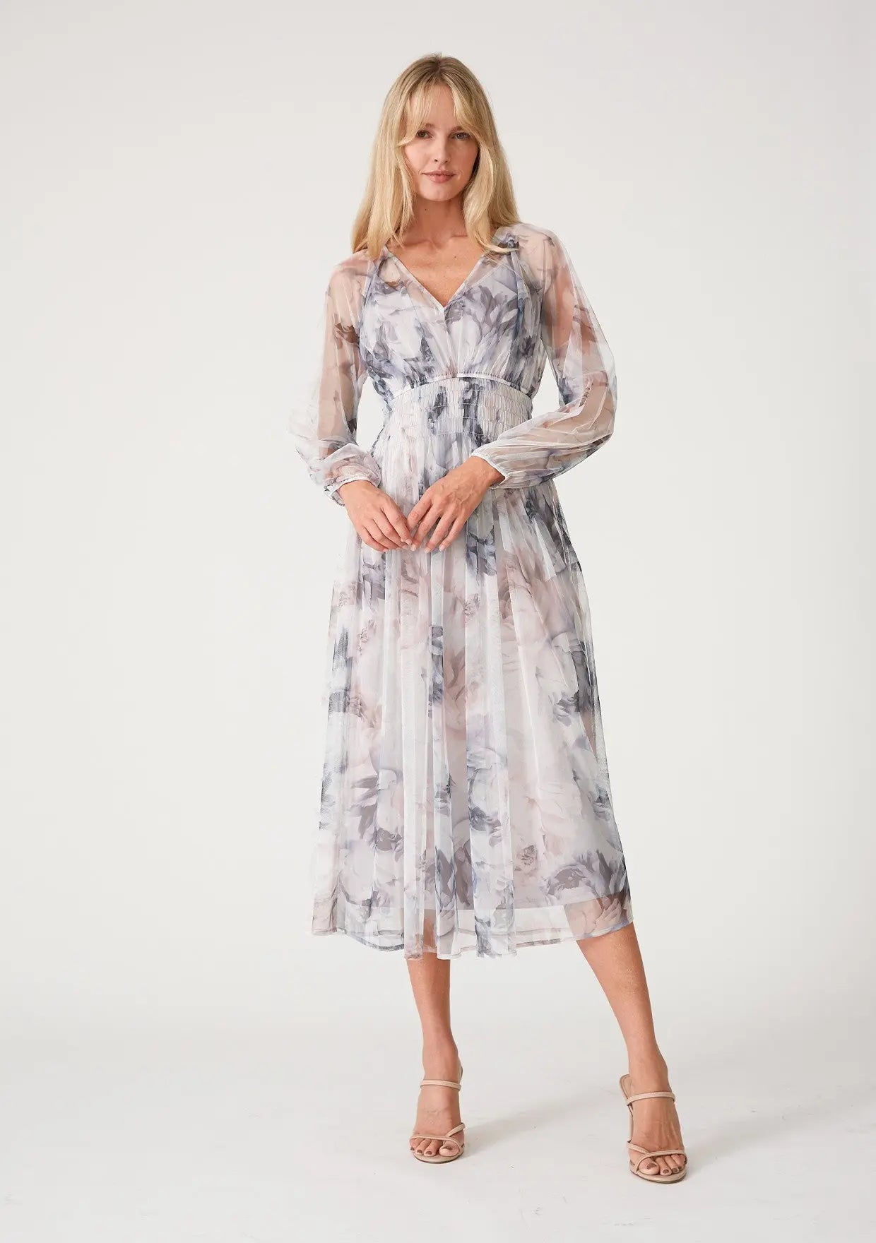 A floral mesh maternity midi dress with a v-neckline, long sleeves, and a smocked waist. Includes a slip that has adjustable straps.