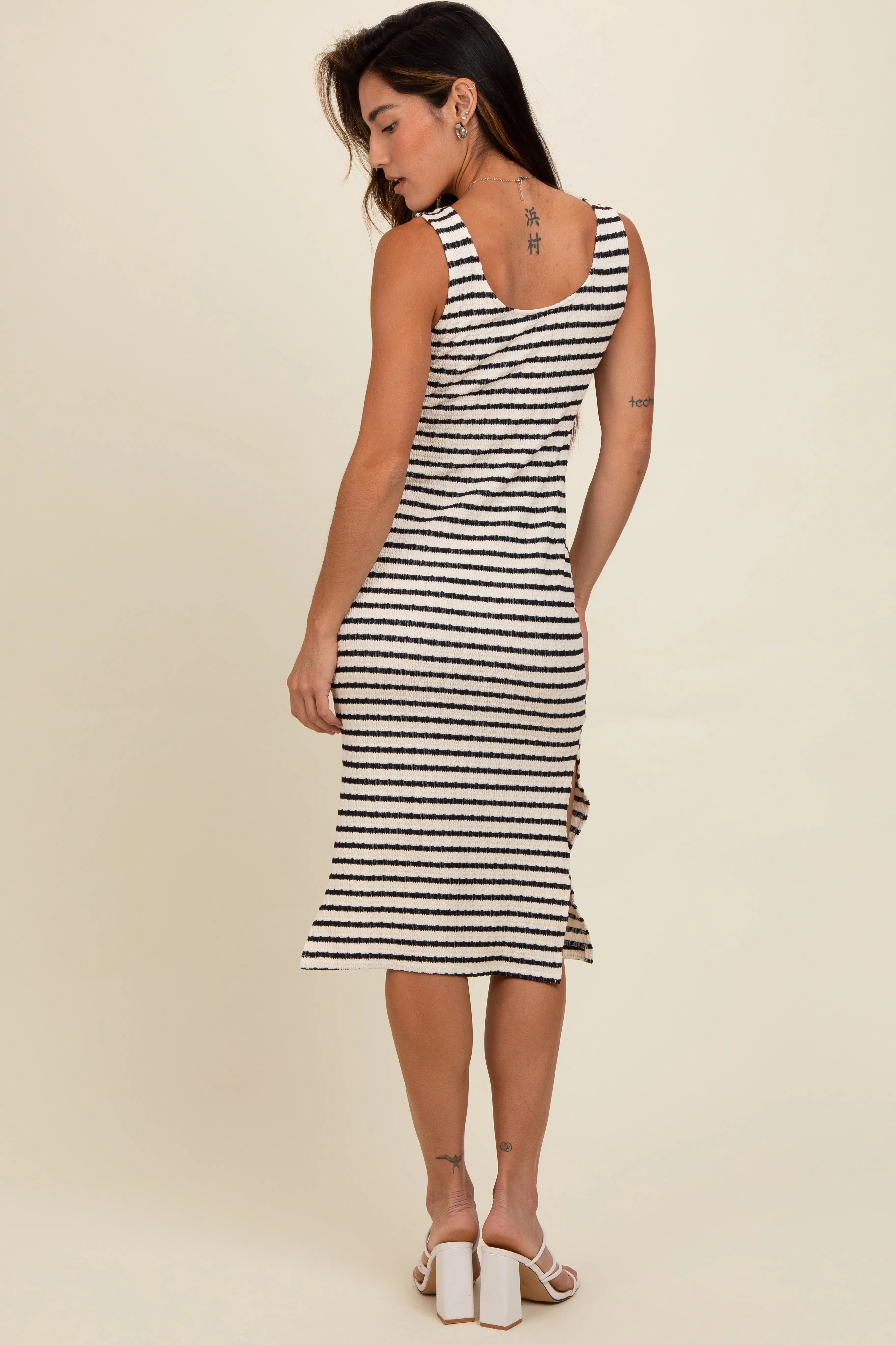 Step out in effortless style with this striped side slit midi dress, designed to flatter your silhouette with a fitted cut and a subtle side slit for easy movement. Crafted from a soft, ribbed knit fabric, it offers all-day comfort while keeping you chic from day to night. Its sleeveless design and scoop neckline add a touch of sophistication, perfect for casual outings or dressier occasions. Pair it with sandals for a relaxed look or heels to elevate your outfit. A versatile wardrobe essential that seamlessly blends comfort and style.