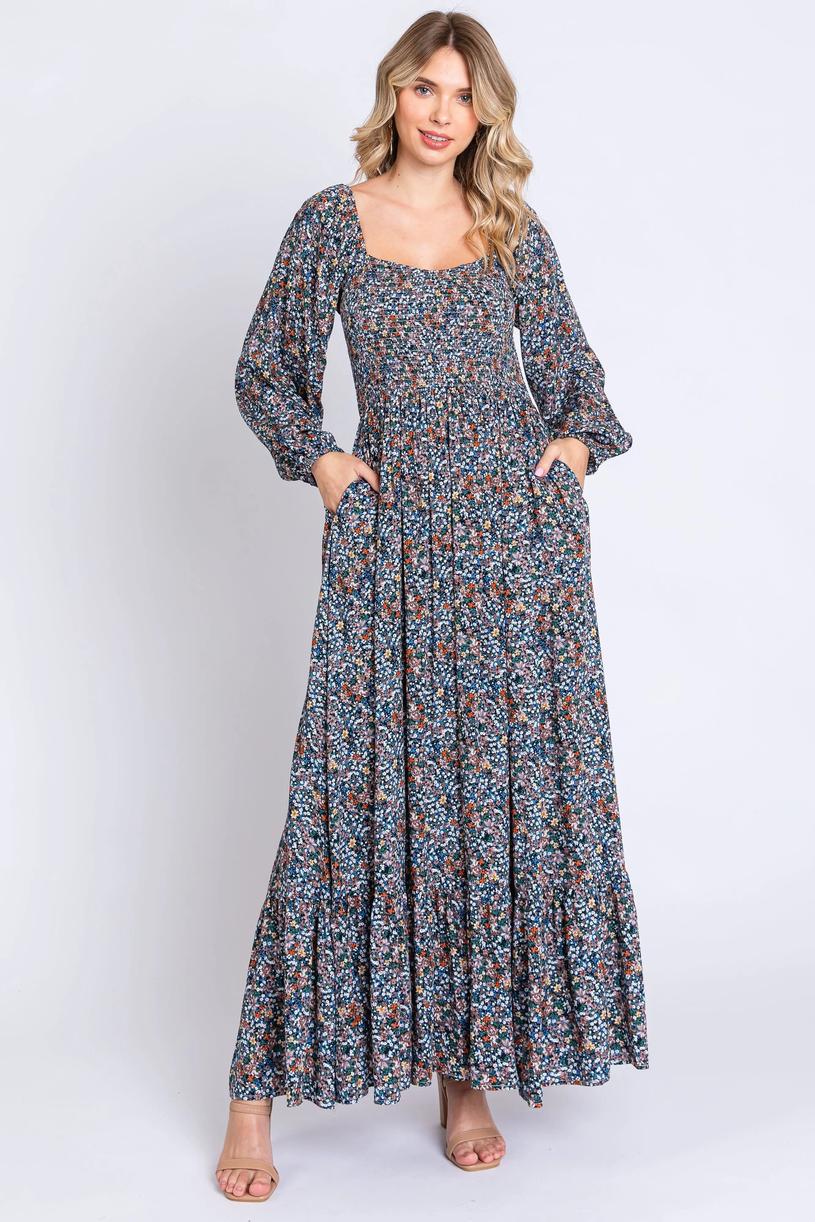 Make a statement at every stage of your pregnancy with our Navy Floral Long Sleeve Maternity Maxi Dress. Featuring a beautiful floral print on soft navy fabric, this dress offers a flattering empire waist and comfy, flowy silhouette to accommodate your changing shape. Long sleeves provide extra warmth and style, making it perfect for any season or occasion. Whether dressed up for a special event or kept casual for everyday wear, you’ll love the confidence and elegance this maxi dress brings. Enjoy all-day comfort and undeniable style—your new maternity favorite awaits!