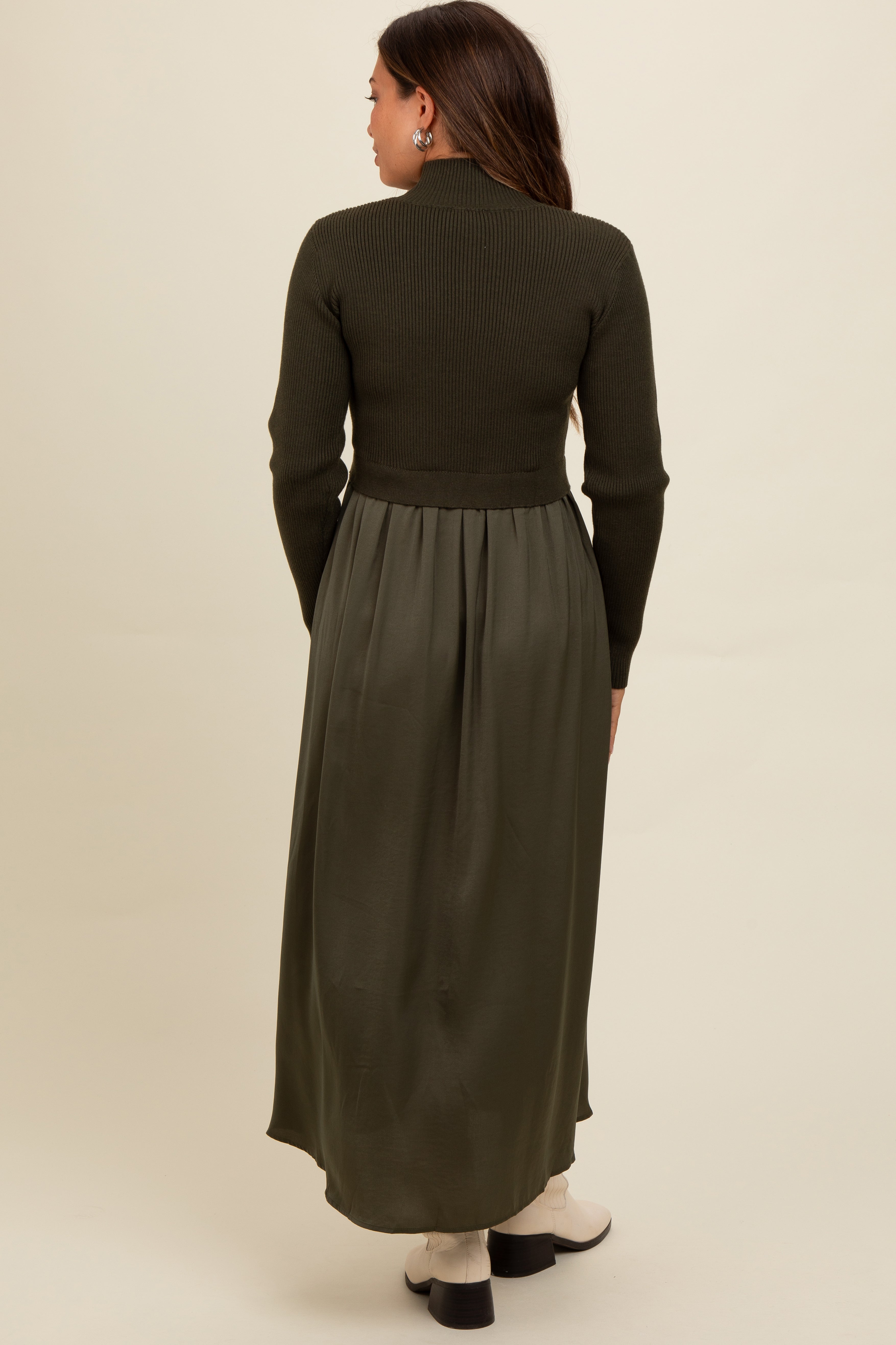 Effortlessly chic, our Knit Contrast Top Satin Maternity Midi Dress is designed to flatter you from bump to baby and beyond. The soft, ribbed knit top offers gentle stretch and comfort, while the luxurious satin skirt adds an elegant touch, making it perfect for brunch, baby showers, or special occasions. An empire waistline creates a beautiful silhouette and accommodates your growing belly. The midi length ensures easy movement and sophisticated style. Versatile and on-trend, this dress is a must-have for every mama-to-be’s wardrobe. Dress it up with heels or keep it casual with flats!