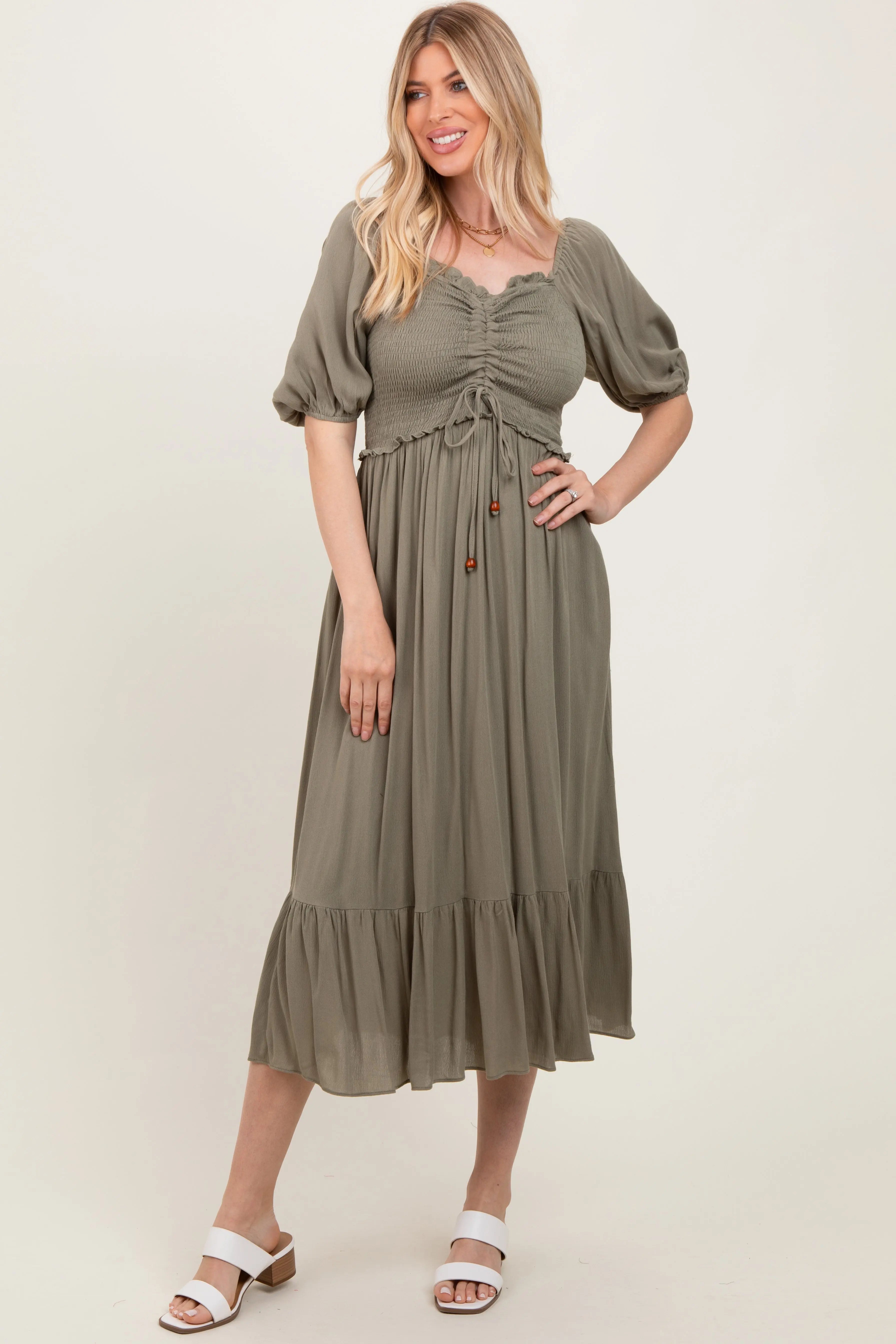 Olive Smocked Cinched Front Maternity Maxi Dress