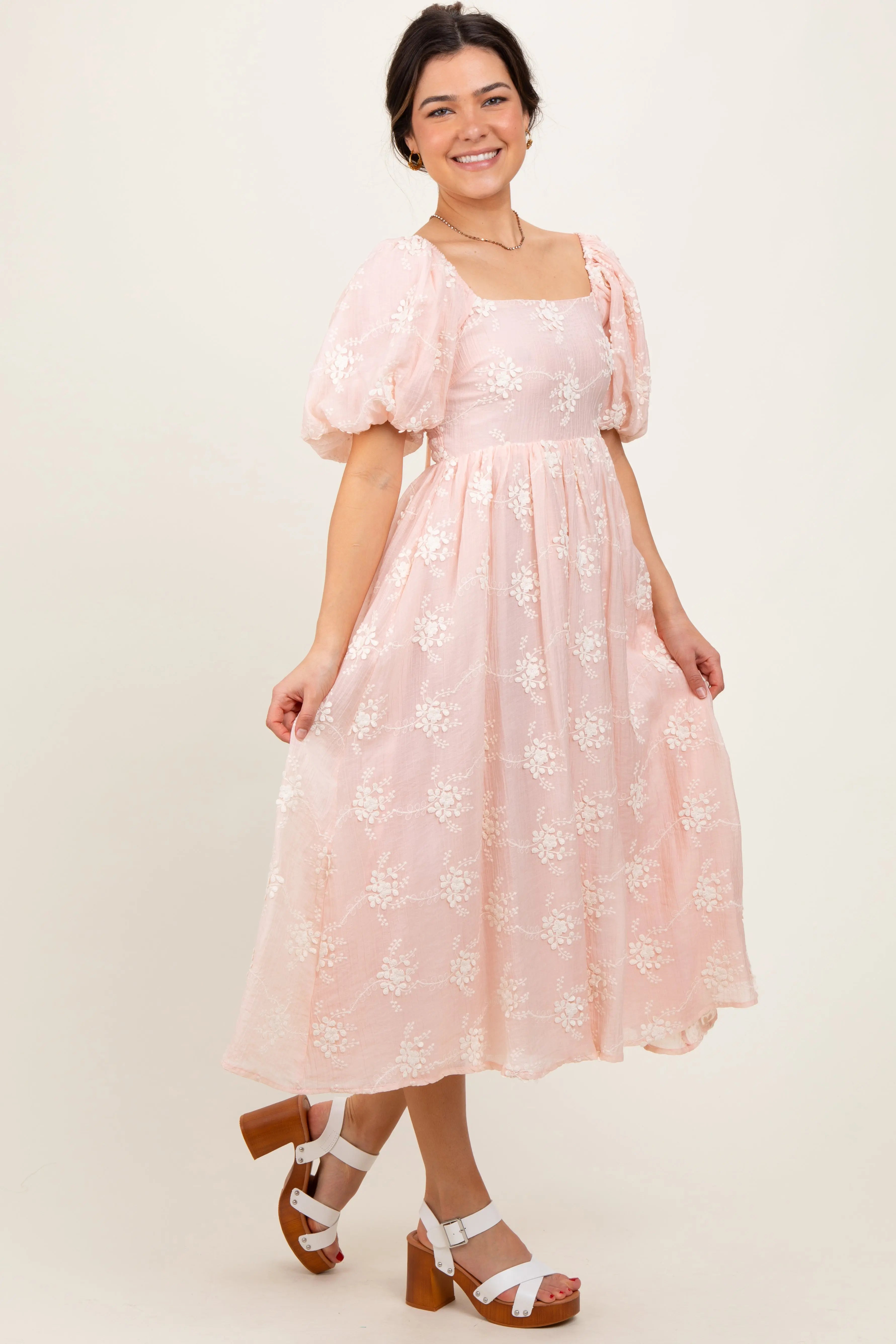 Step into effortless elegance with our Pink Textured Midi Dress. Featuring a delicate floral embossed fabric, this dress blends classic charm with modern style. The square neckline and voluminous puff sleeves create a flattering silhouette, while the fitted bodice flows into a soft, gathered midi skirt for comfortable movement. Perfect for daytime events, garden parties, or weekend brunches, this dress pairs beautifully with your favorite sandals or heels. Embrace femininity and timeless grace in this must-have piece for your wardrobe. Available in sizes XS to XL.