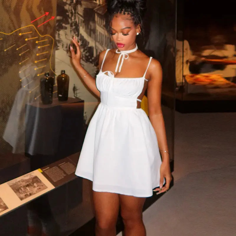 Simple Women Pleated Solid Color A line Dress Backless Lace up Boat Neck Short Dress Bella Mia