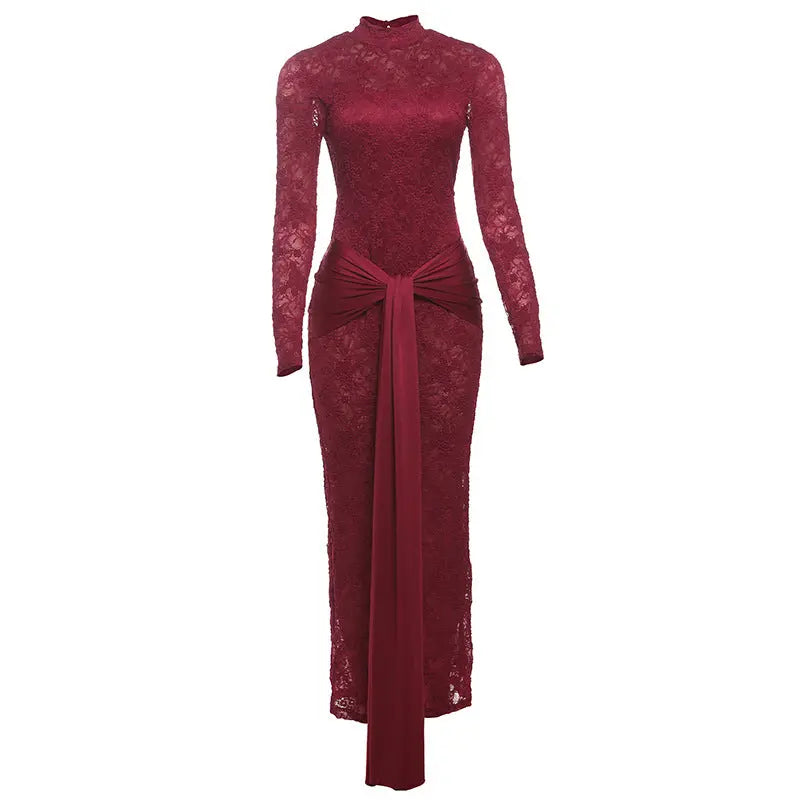 Women Clothing Autumn Lace Sexy See through Hollow Out Cutout Slim round Neck Backless Long Sleeves Dress Women Bella Mia