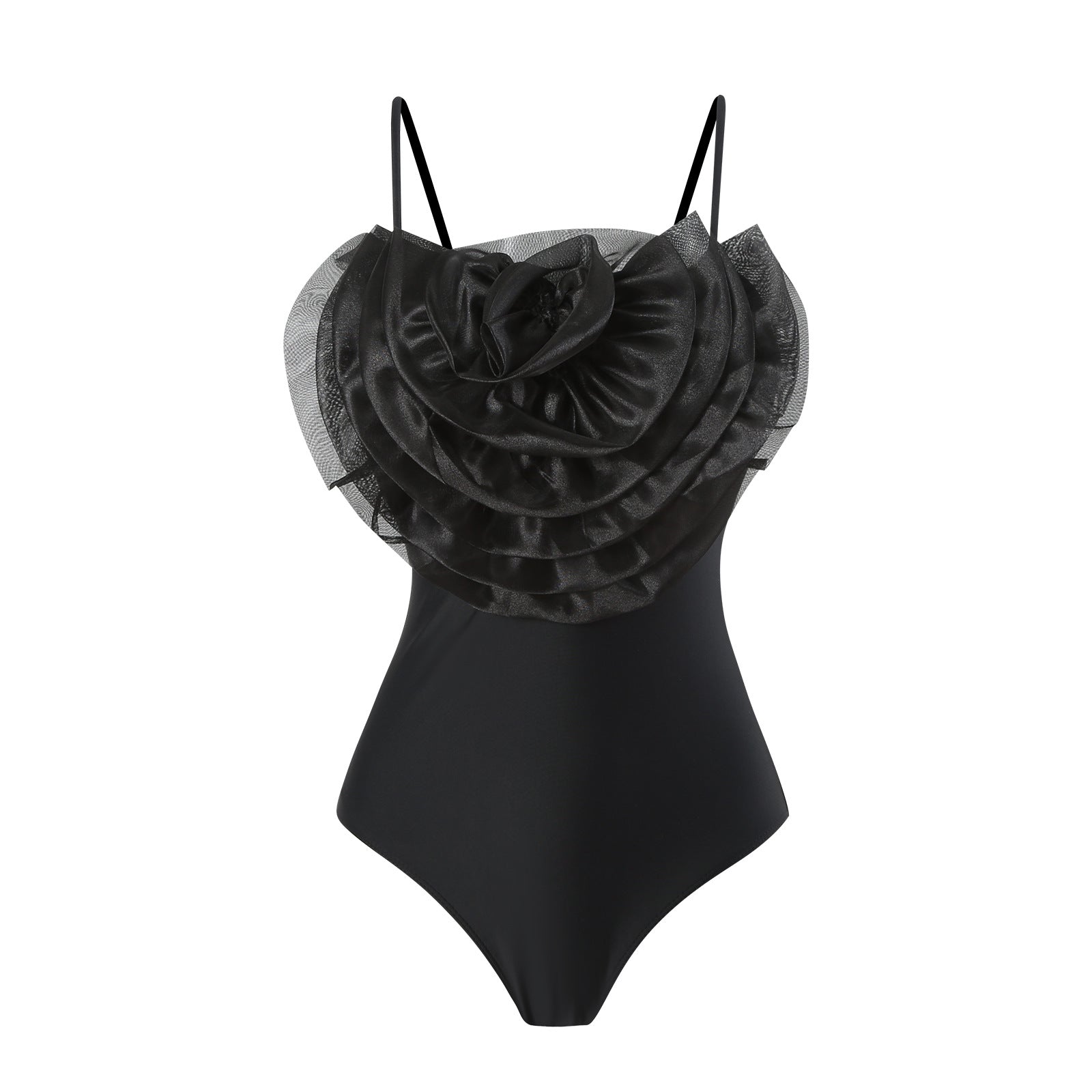 This beach-ready ensemble combines a sleeveless nylon swimsuit with a striking 3D flower applique that sits prominently at the bust, creating a focal point while maintaining coverage at the midsection. The backless design is balanced by a midsection wrap, offering modesty when desired and a flattering silhouette during sun, sand, or poolside activities.