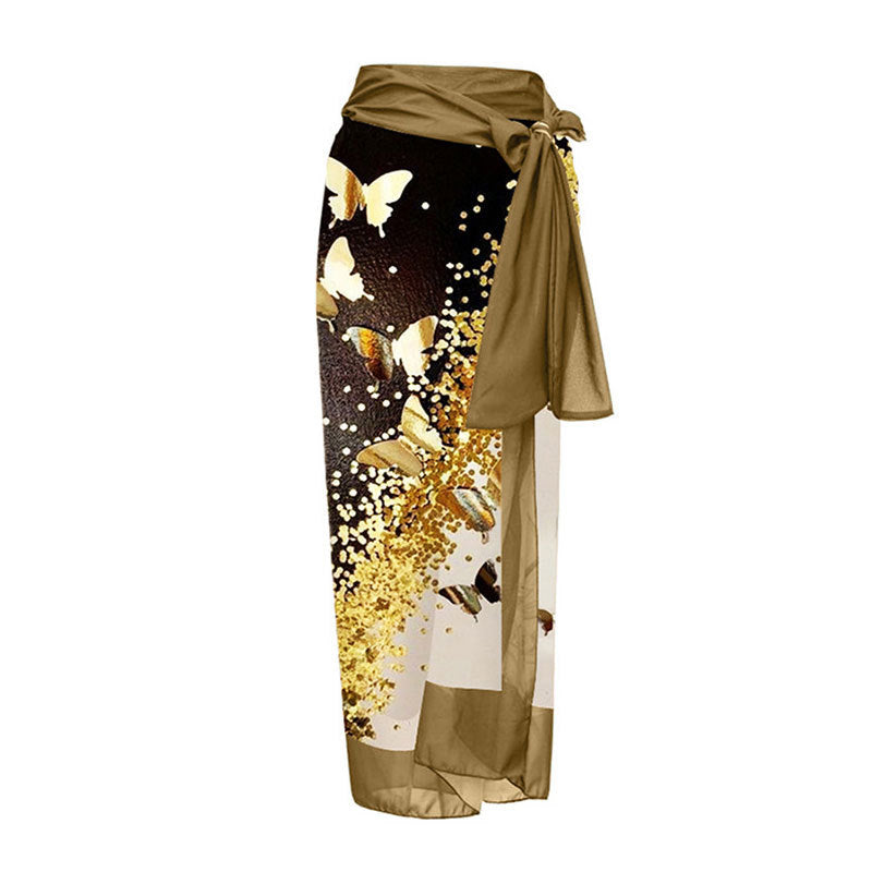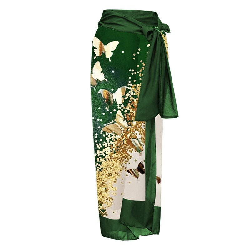 The Sexy Siamese Conservative Cover Belly Thin Swimsuit Spring Bathing Suit Women Chiffon Beach Dress is fashioned in a boho vacation style with a flattering silhouette. The fabric is polyester, offering durability and quick-drying comfort for summer days by the water. The pattern showcases florals with butterfly accents and gold detailing, set against a rich green base with light contrast panels. Sleeveless construction and decorative tie-shoulder straps provide a secure, adjustable fit. A coordinating chiffon wrap is included for versatile styling as a beach cover-up or light dress. This piece is designed for summer, poolside lounging, and resort wear.
