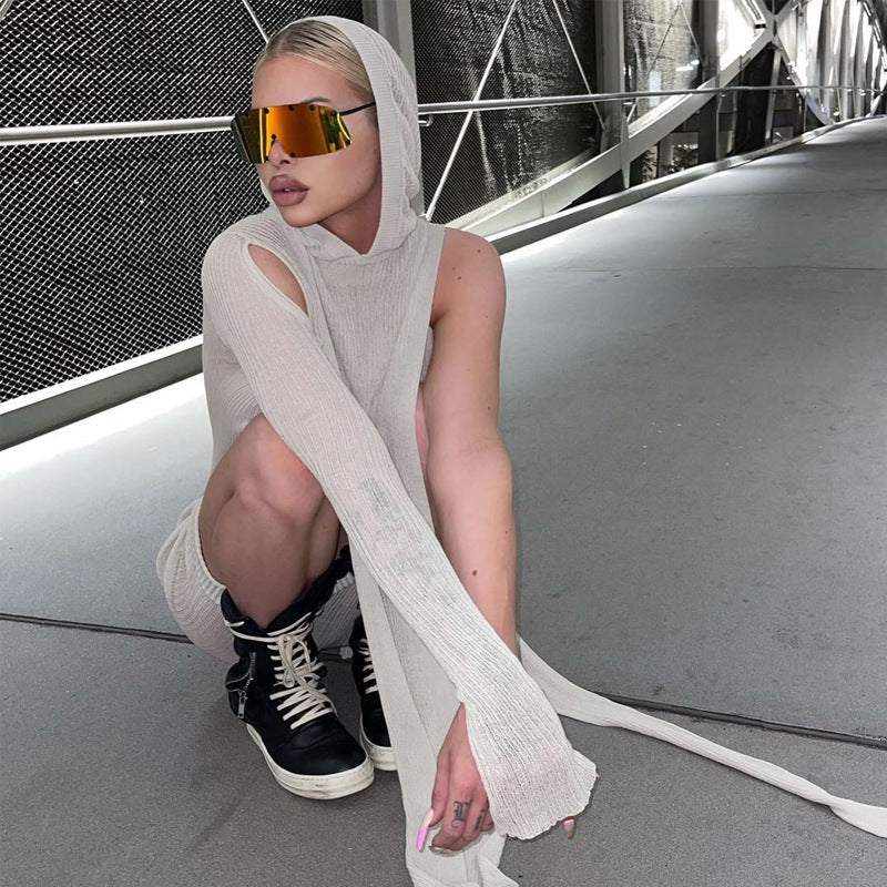 Women Clothing Autumn Fashionable See-through Irregular Asymmetric Shoulder Long Sleeve Hooded Dress