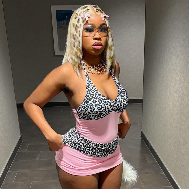 Product images show the dress from multiple angles, highlighting a figure-skimming sheath silhouette with a halter neckline and a plunging deep V. A lace-up detail provides an adjustable fit while preserving a clean line. The bodice combines leopard print stitching with color-block panels in soft pink, enhanced by subtle patchwork for visual interest.