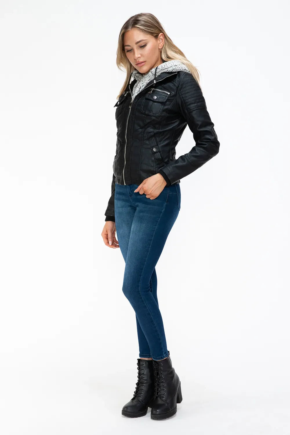 YMI Removable Faux Layered Multi-Pocket Jacket with Fuzzy Hood