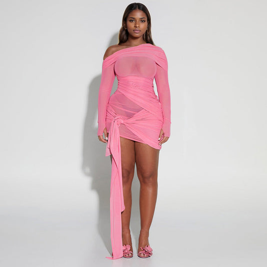 Spring Summer Women Sexy Diagonal Collar High Waist Figure Flattering Sheath Solid Color Dress