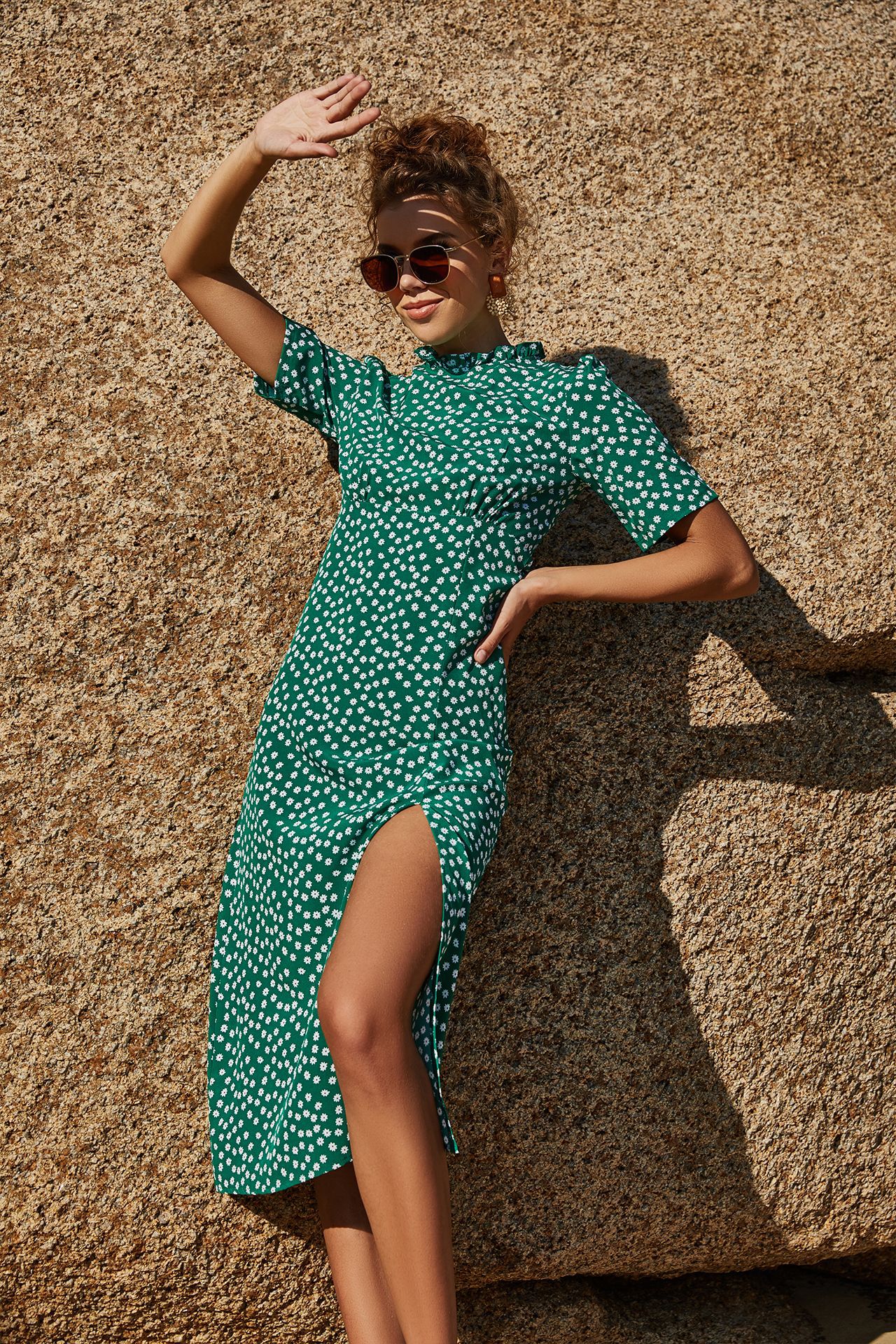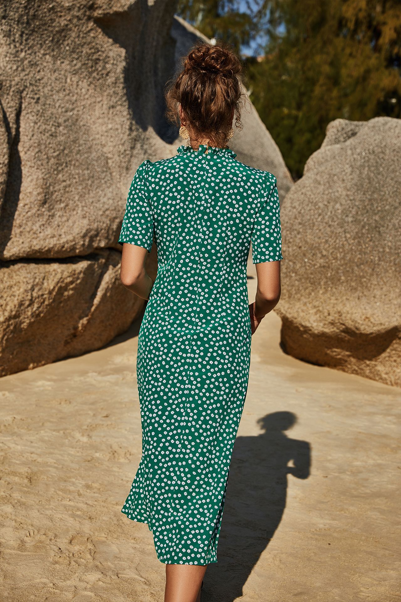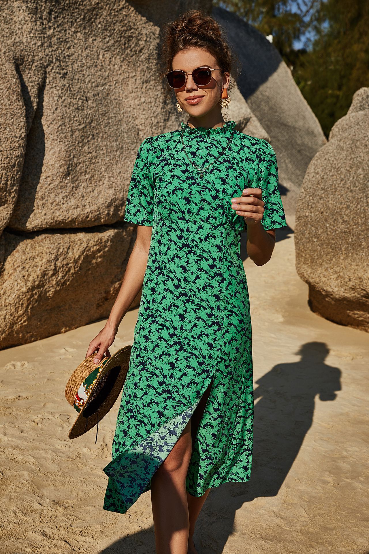 Summer Women Clothing Slimming Sheath Slit Slim-Fitting Floral Short Sleeve Vacation Large Swing Dress