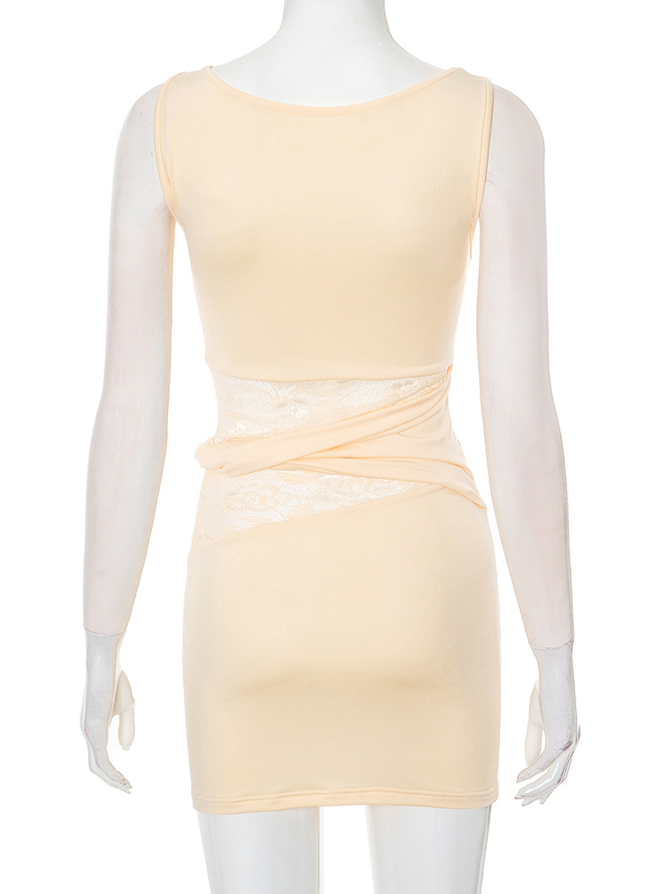Women Clothing Slim Fit Sheath Sleeveless Turtleneck Lace Hollow Out Cutout Twist Ring Dress