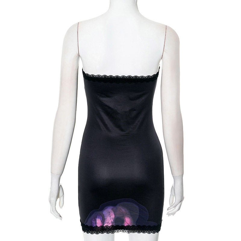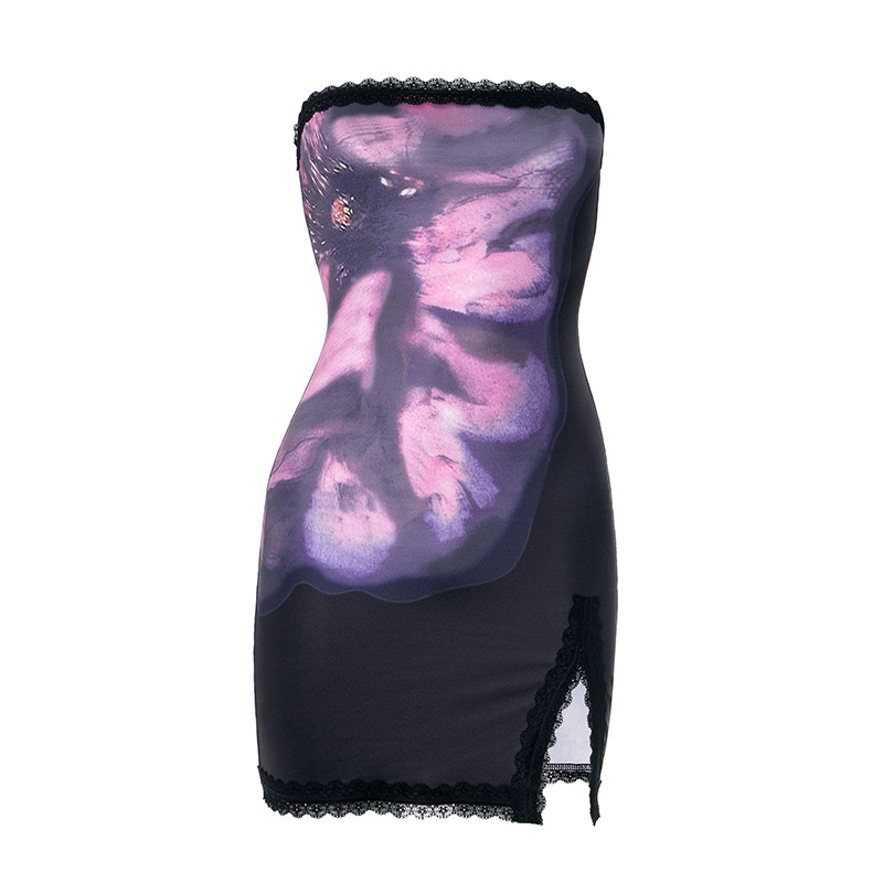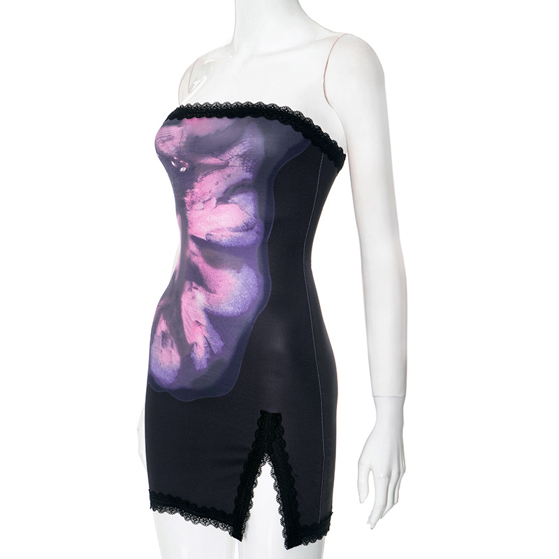 Women Clothing Spring Summer Tube Top Floral Print Lace Trim with Slit Sheath Dress
