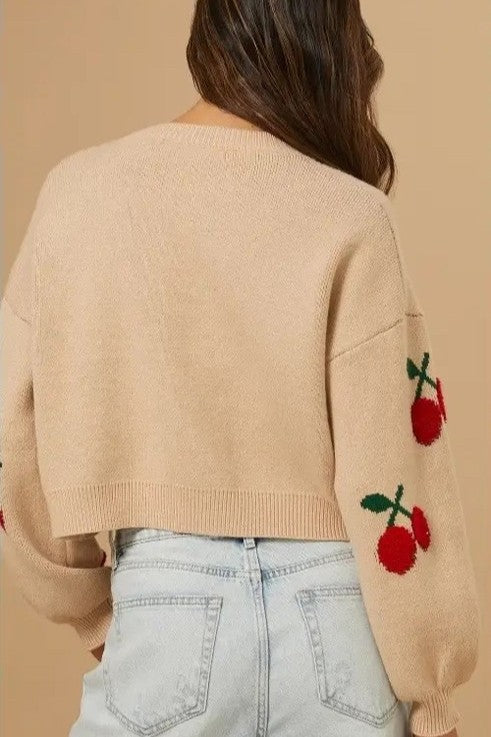 This knit sweater features playful cherry embroidery on a soft neutral base, creating a sweet yet trendy look. The cropped silhouette enhances the waistline, while the classic round neckline ensures easy styling. A perfect piece for cozy, youthful autumn and early spring outfits.