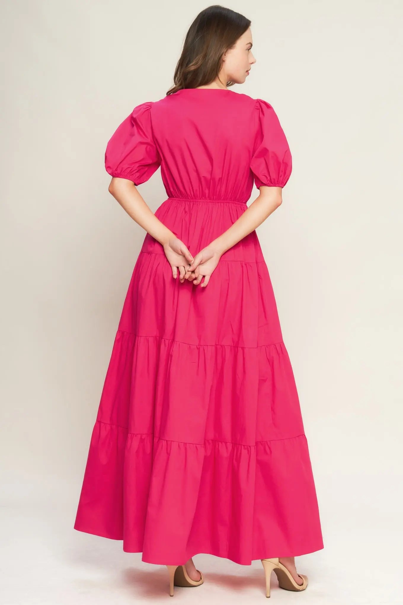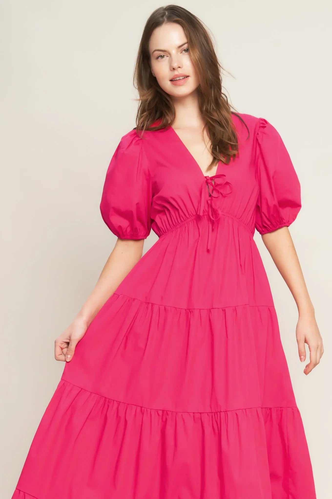 Fuchsia Cotton Woven Maxi Dress With V Neck Front Bow Closure And Puff Sleeves Flying Tomato