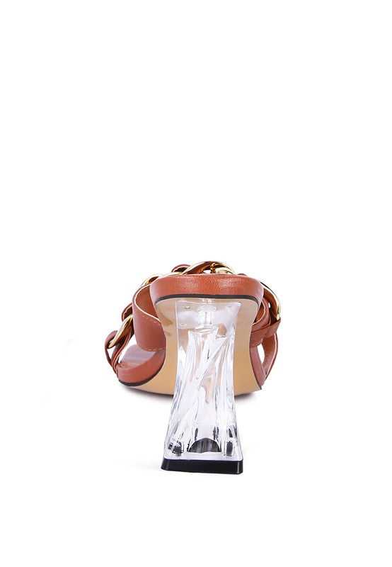 Indulge in the beauty of the Day In London: Clear Heel Gold Chain Sandals. These stylish slides feature a square toe, a comfortable mid heel with a clear twist, and metal buckle details on the strap. Designed to elevate your summer looks, these sandals are made with high-quality polyurethane for the upper and lining material, and a TPR outer sole for durability. The open square toe, shiny metal detail, and slip-on design add the perfect touch of elegance to these casual sandals. Whether you're running errands or heading to a brunch date, these sandals with a 3.1 inch heel will keep you comfortable and looking fabulous. Made in China with a material composition of polyurethane, these sandals are a must-have for any fashion-forward individual.