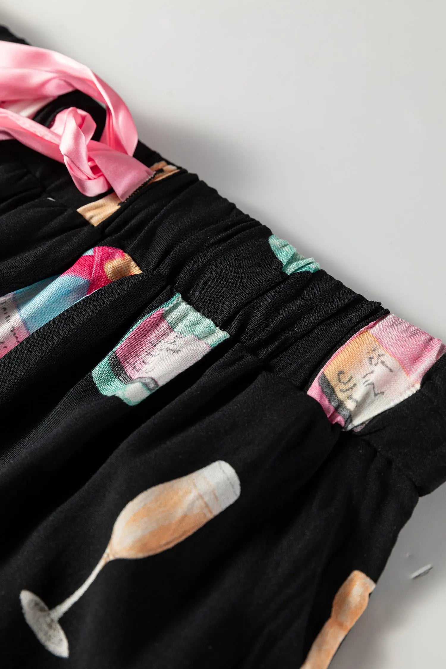 The ensemble includes a coordinating top and shorts, ensuring an effortless, stylish look for daily wear or festive evenings. Color is black; details include knot and bow accents and the wine print.