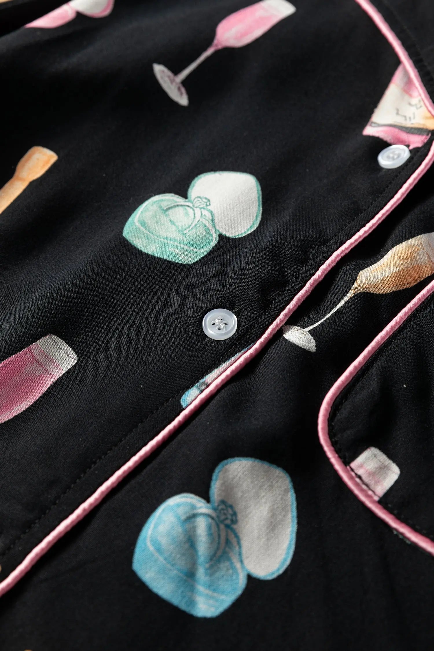 Black Christmas Wine Glass Print Bow Knot Two Piece Pajama Set offers cozy holiday lounging with a whimsical wine glass print and playful bow knot details. This complete set includes a long-sleeve top and coordinating shorts, designed for festive comfort.