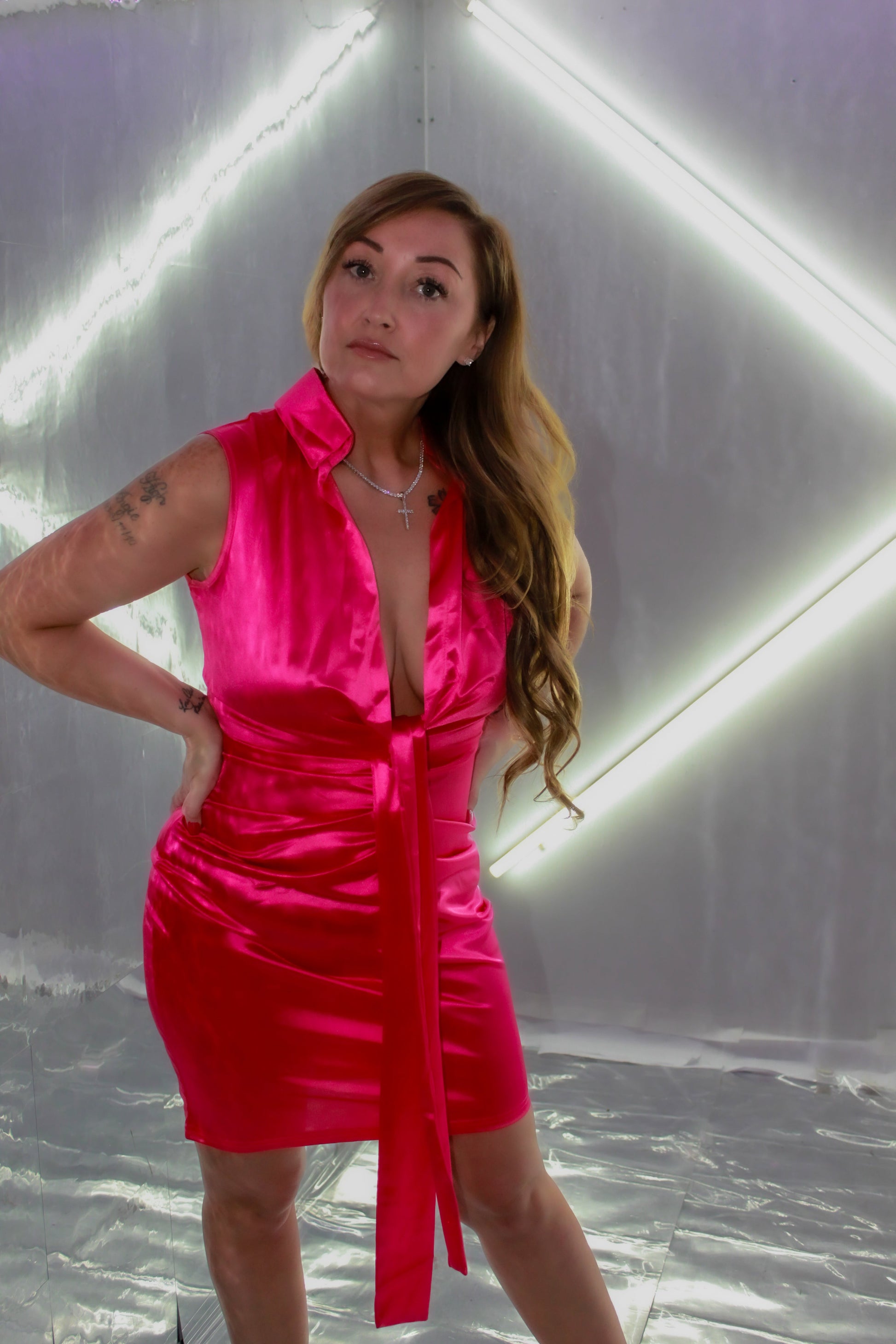 Turn up the heat and steal the spotlight in our Slim Fit Satin Gloss V-Neck Dress! This fuchsia stunner is made for the bold and confident—perfect for evenings that call for unforgettable glamour. The sleek satin finish adds a luxurious touch, while the lace-up back and sleeveless design give just the right amount of flirt. Whether you're dancing the night away or sipping cocktails by the bar, this mini dress is your ultimate go-to for style and sass. Pair it with your favorite heels and a statement clutch to complete the look. 💃