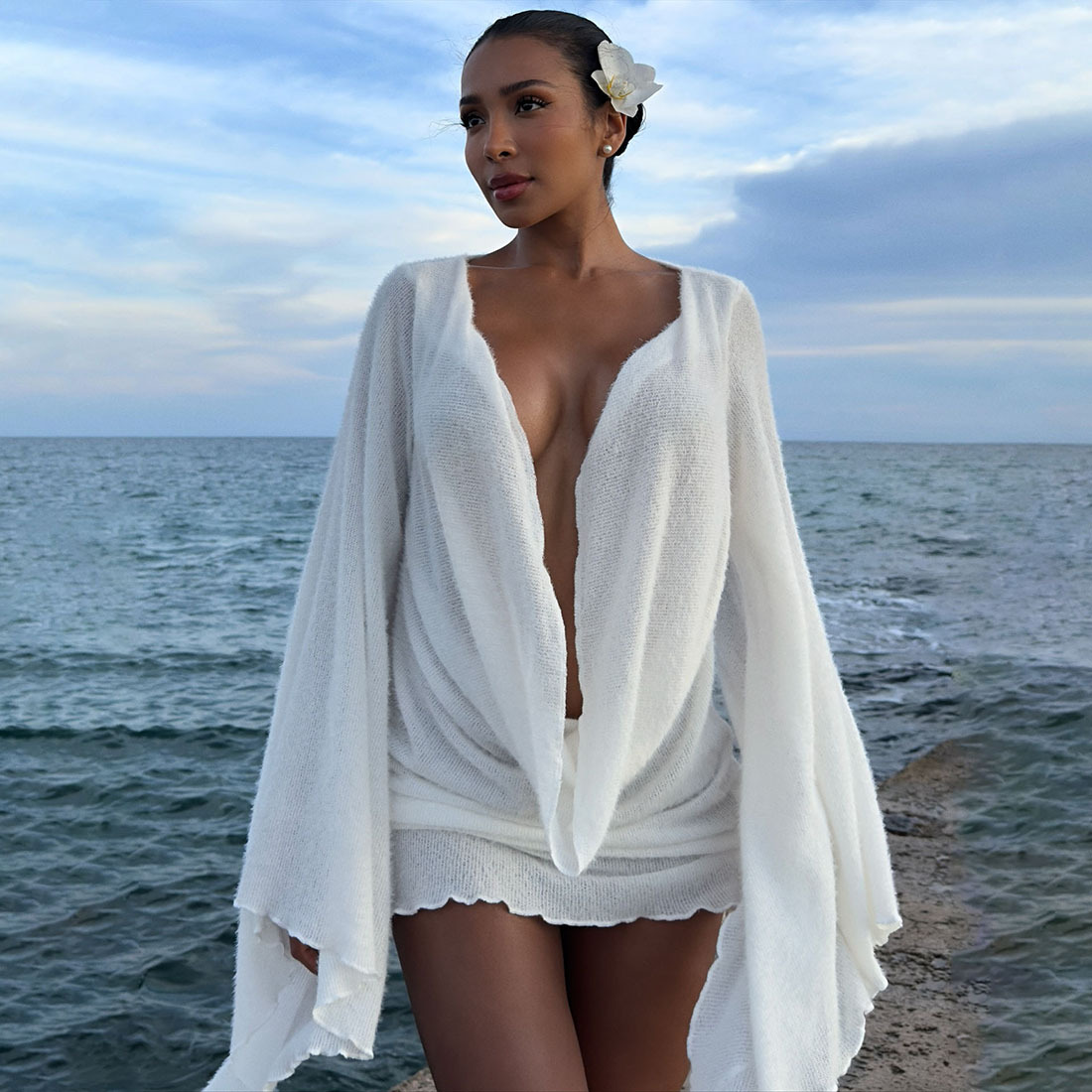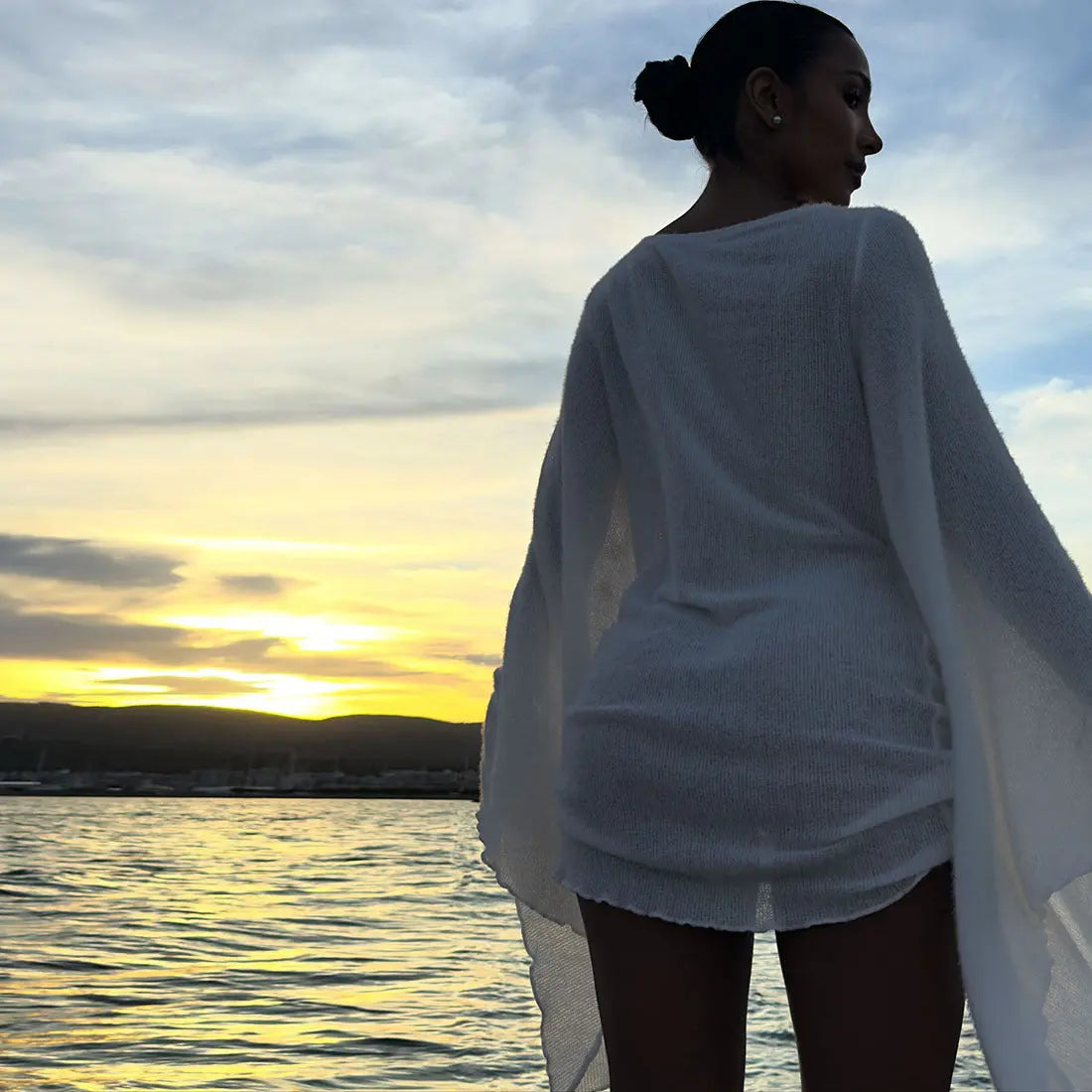 Autumn Winter Sexy Swing Collar Bell Sleeve Solid Color Sheath Short Bella Mia