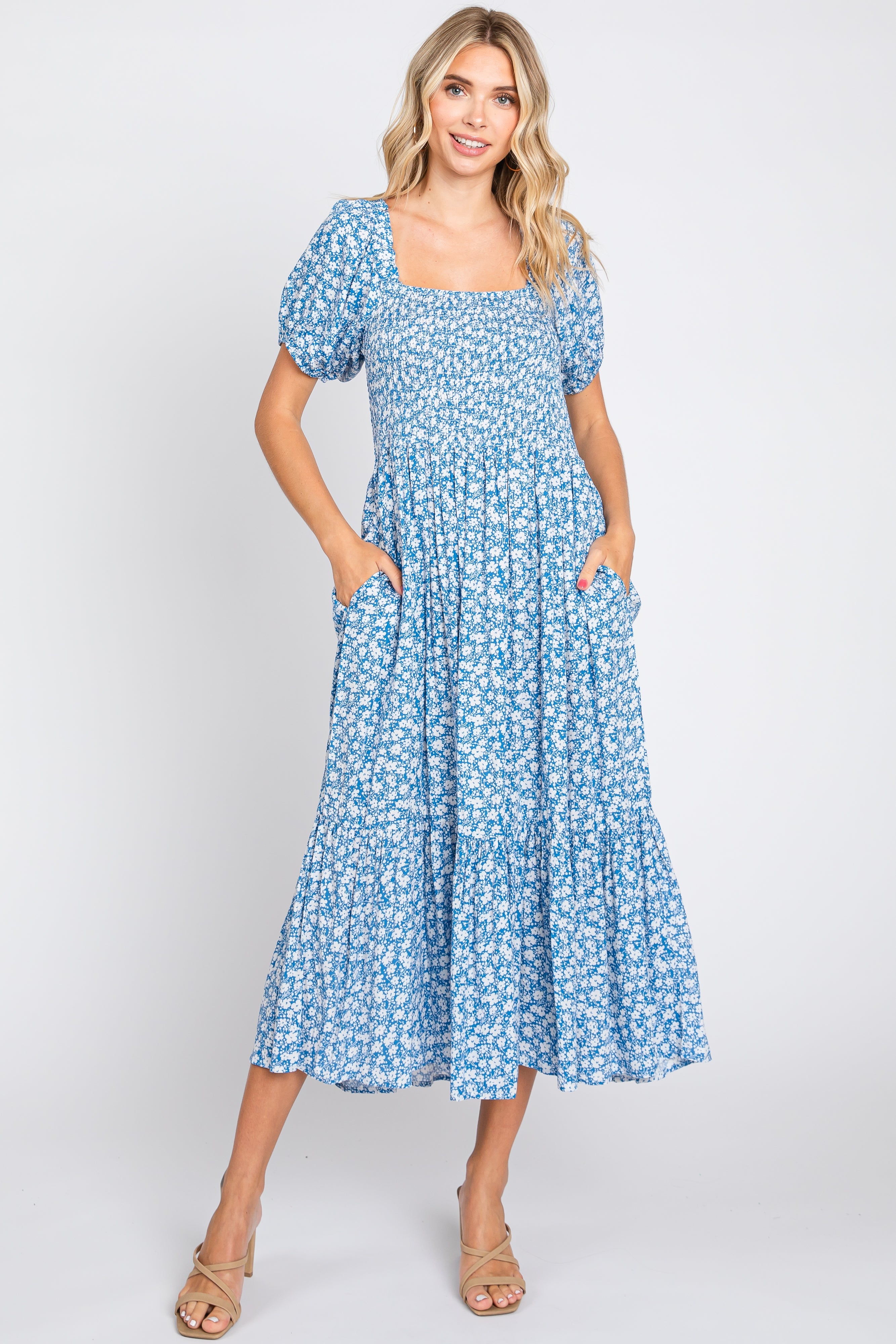 A floral print maternity midi dress featuring a square neckline with ruffle trim at the shoulder, short puff sleeves, a smocked elastic top, side pockets and a ruffle hem.