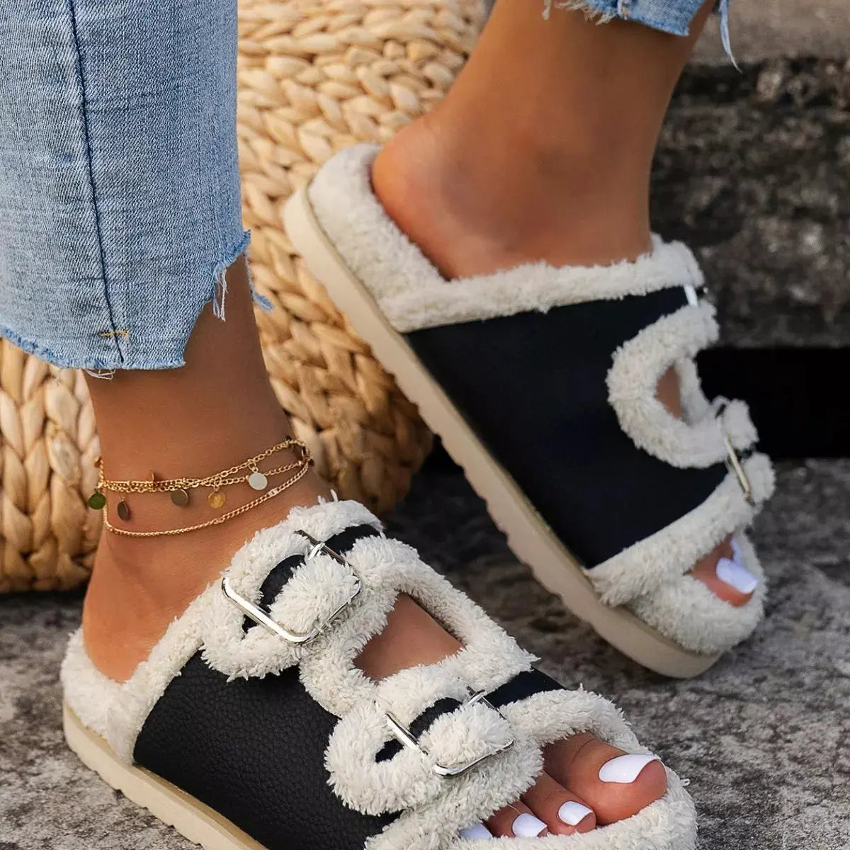 Buckle Decor Plush Lined Platform Slippers Simply Love