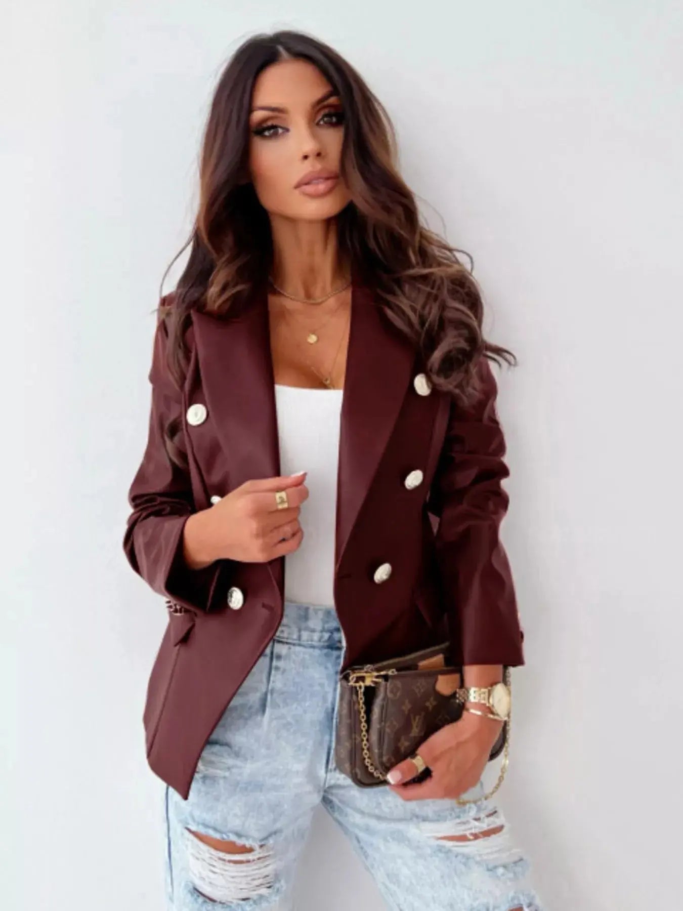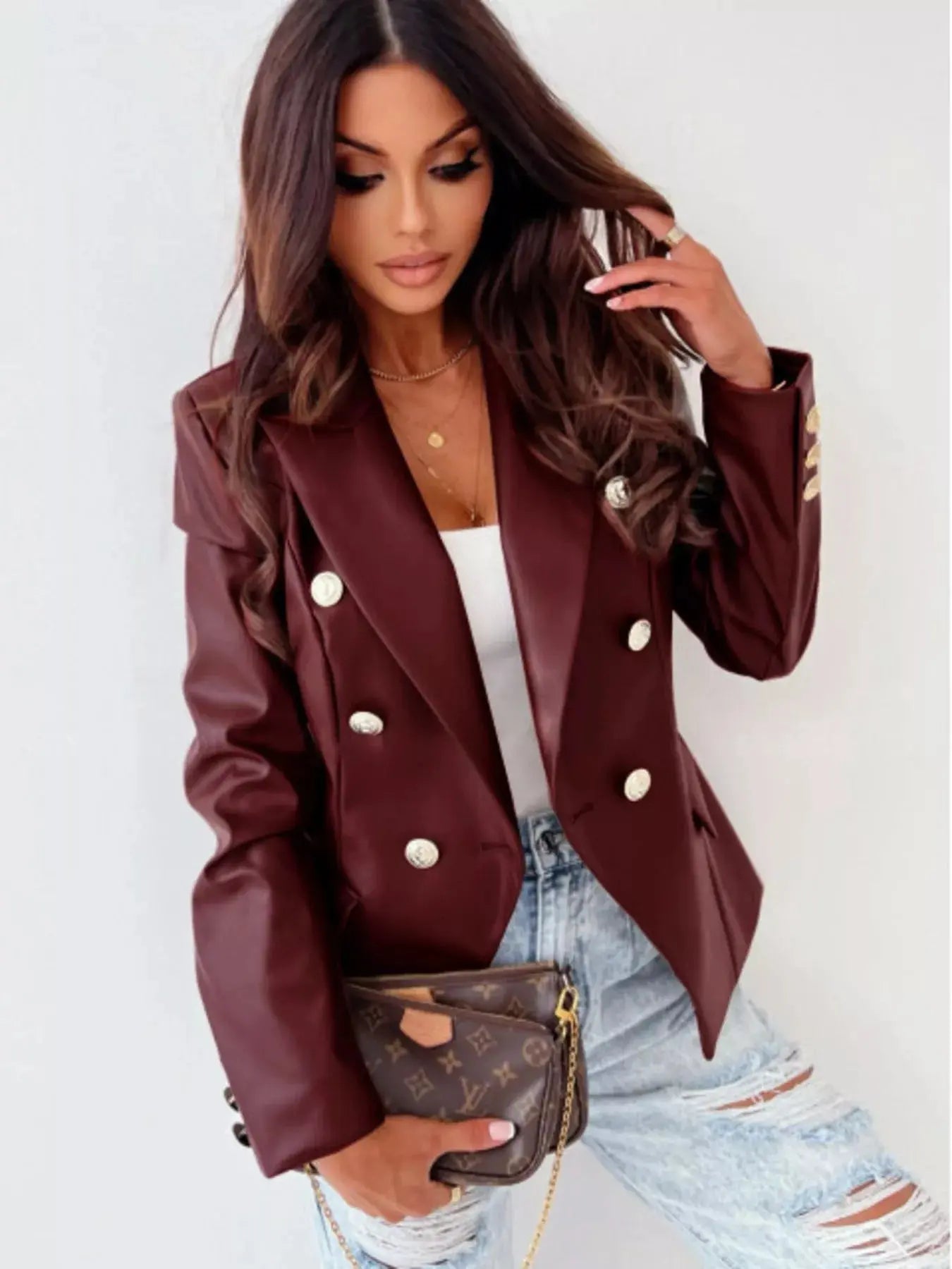 Brown Double Breasted Lapel Collar Leather Blazer For Women Simply Love
