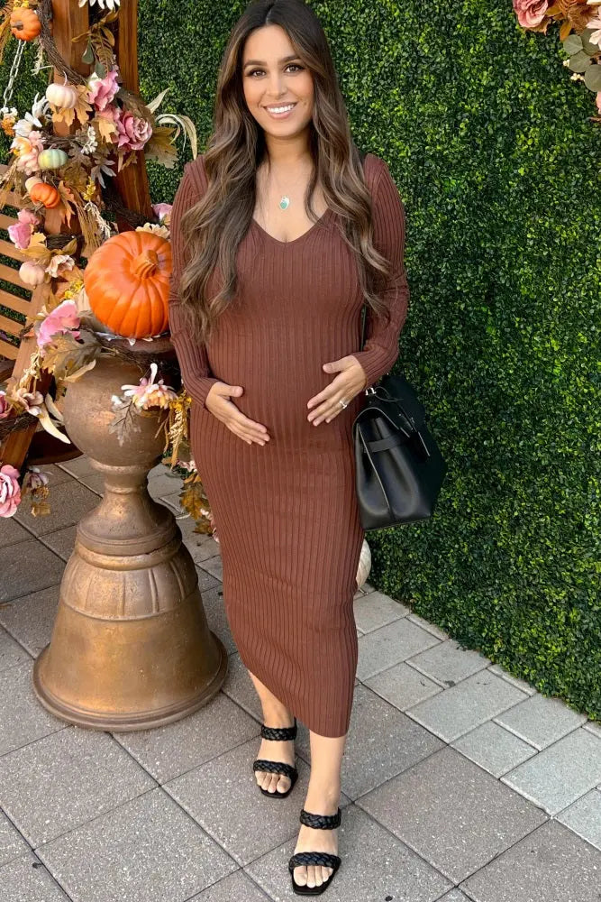Embrace timeless style and comfort with our V-Neck Long Sleeve Fitted Maternity Maxi Dress. Crafted in a soft, stretchy fabric, this elegant maxi flatters your growing bump while offering a sleek, figure-hugging silhouette. The flattering v-neckline and long sleeves make it perfect for layering through every season, while the versatile hue suits any occasion—from baby showers to casual outings. Effortlessly transition from day to night with this must-have maternity essential. Designed to move with you from pregnancy and beyond, it’s a chic staple your wardrobe will love!