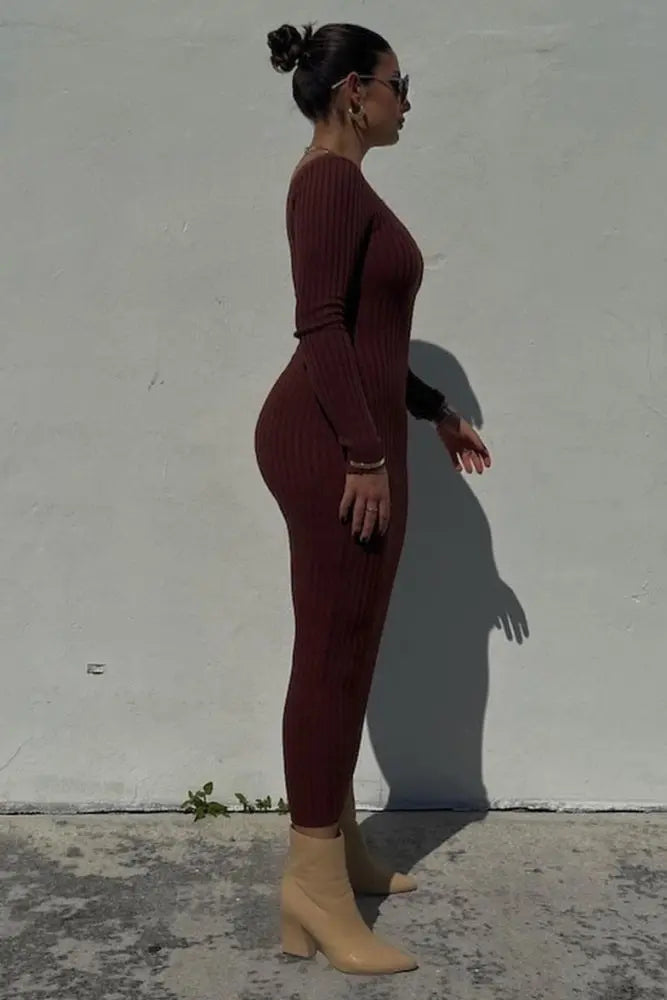 A solid hued fitted maxi dress featuring long sleeves and a v-neckline.