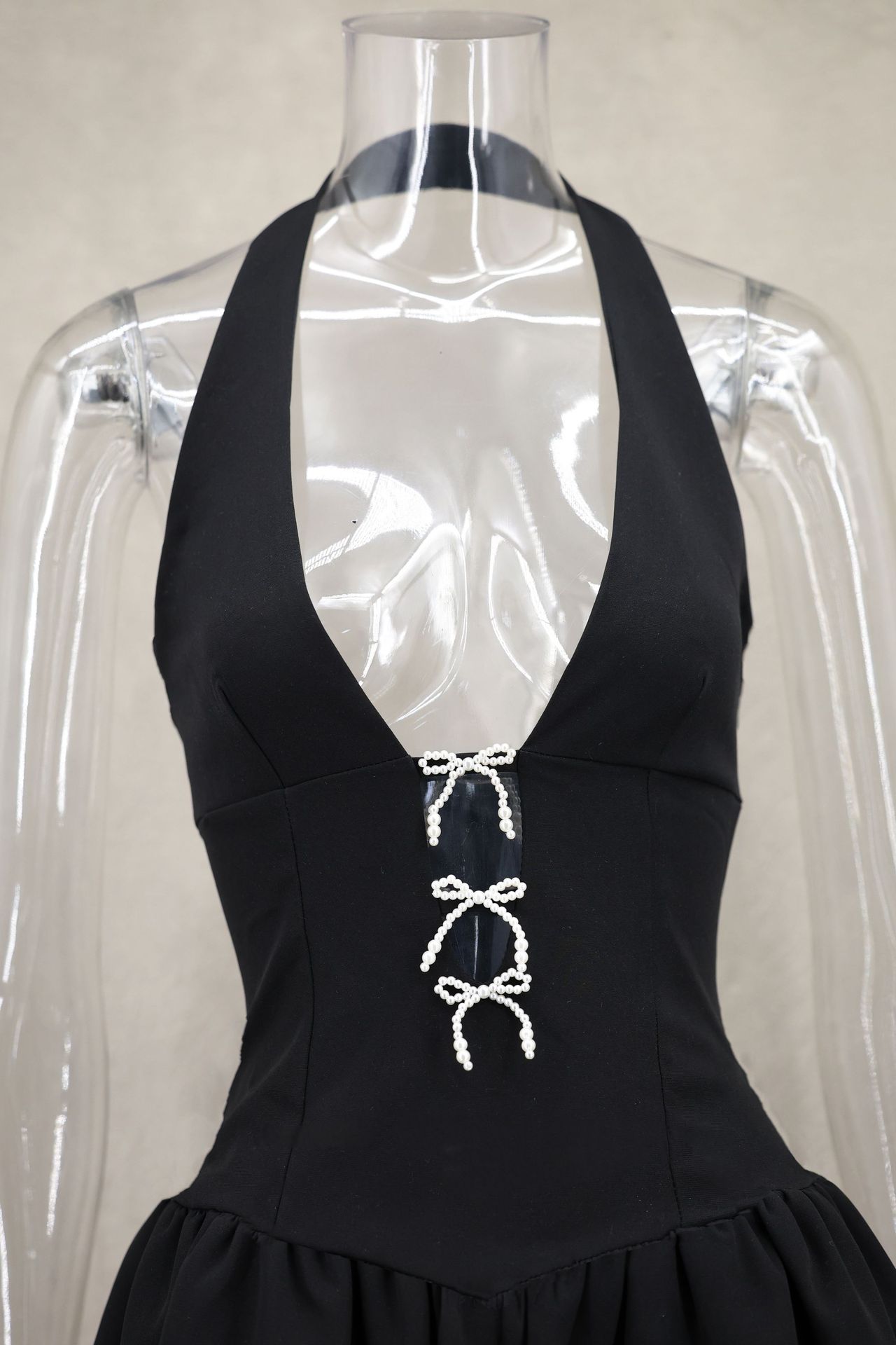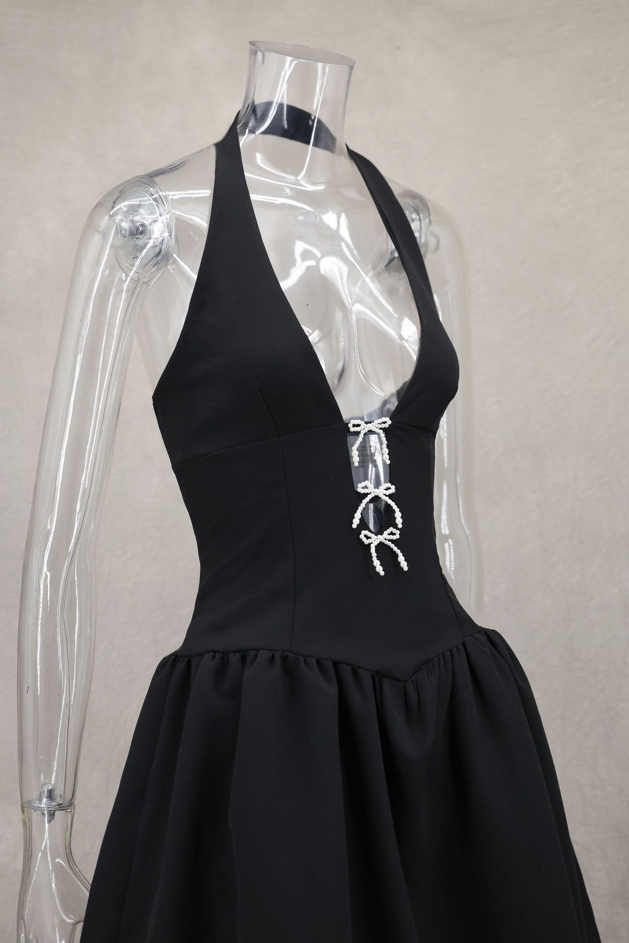 Overview. This knee-length, A-line dress combines sultry detailing with elegant structure. The halter neckline creates a deep V plunge, while the backless design delivers a dramatic silhouette. The fitted bodice features ruched panels and front cutouts accented by bow elements, finished with a concealed zipper for a smooth fit.