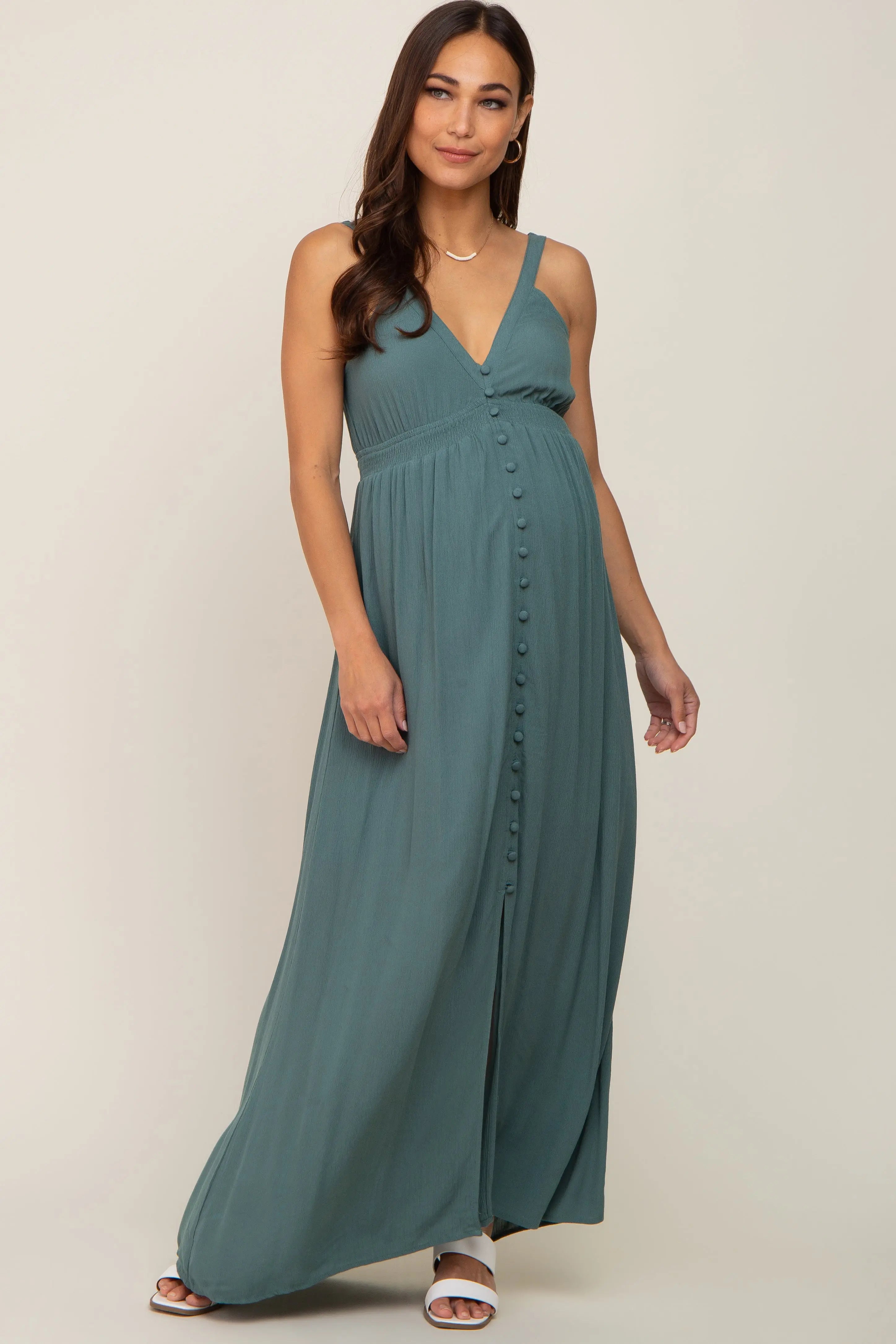 A solid maternity maxi with button accents, a v-neckline, an elastic smocked waist, a front slit, and back cutout. Skirt is lined.
