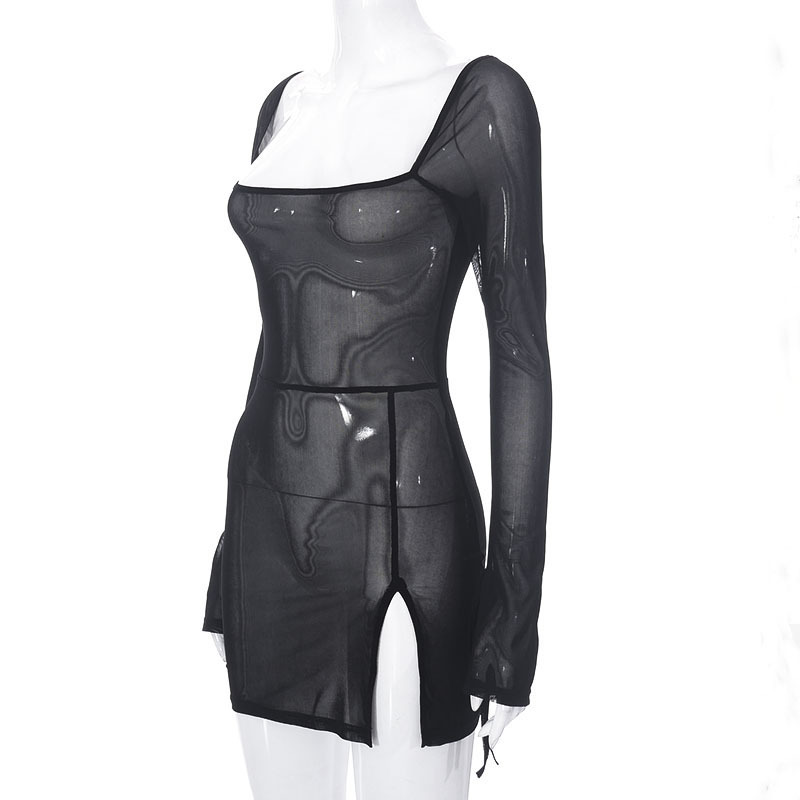 Women Clothing Spring Summer Solid Color Mesh Long Sleeve Split Short Dress for Women
