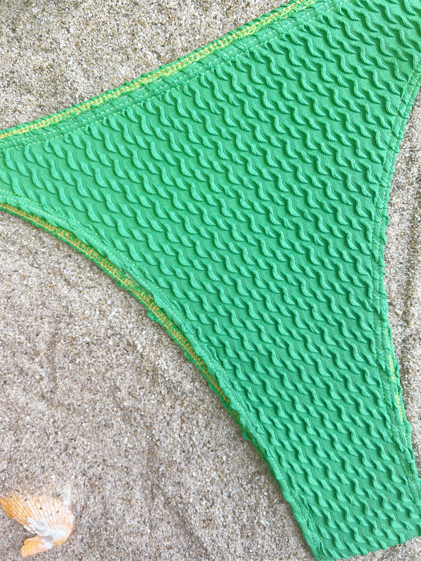 The bikini combines a textured polyester fabric with a solid green color for a bold, vacation-ready look. The top features an asymmetric, one-shoulder silhouette with a center cutout and a decorative lace-up tie. A small pearl accent along the strap adds a subtle touch of elegance.