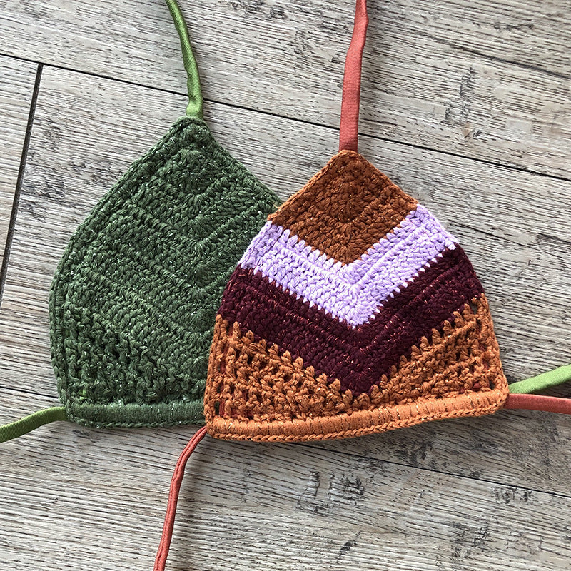 Pure Cotton Hand Crocheting Silver Thread Sexy Beach Bikini Set Three Color Striped Swimsuit